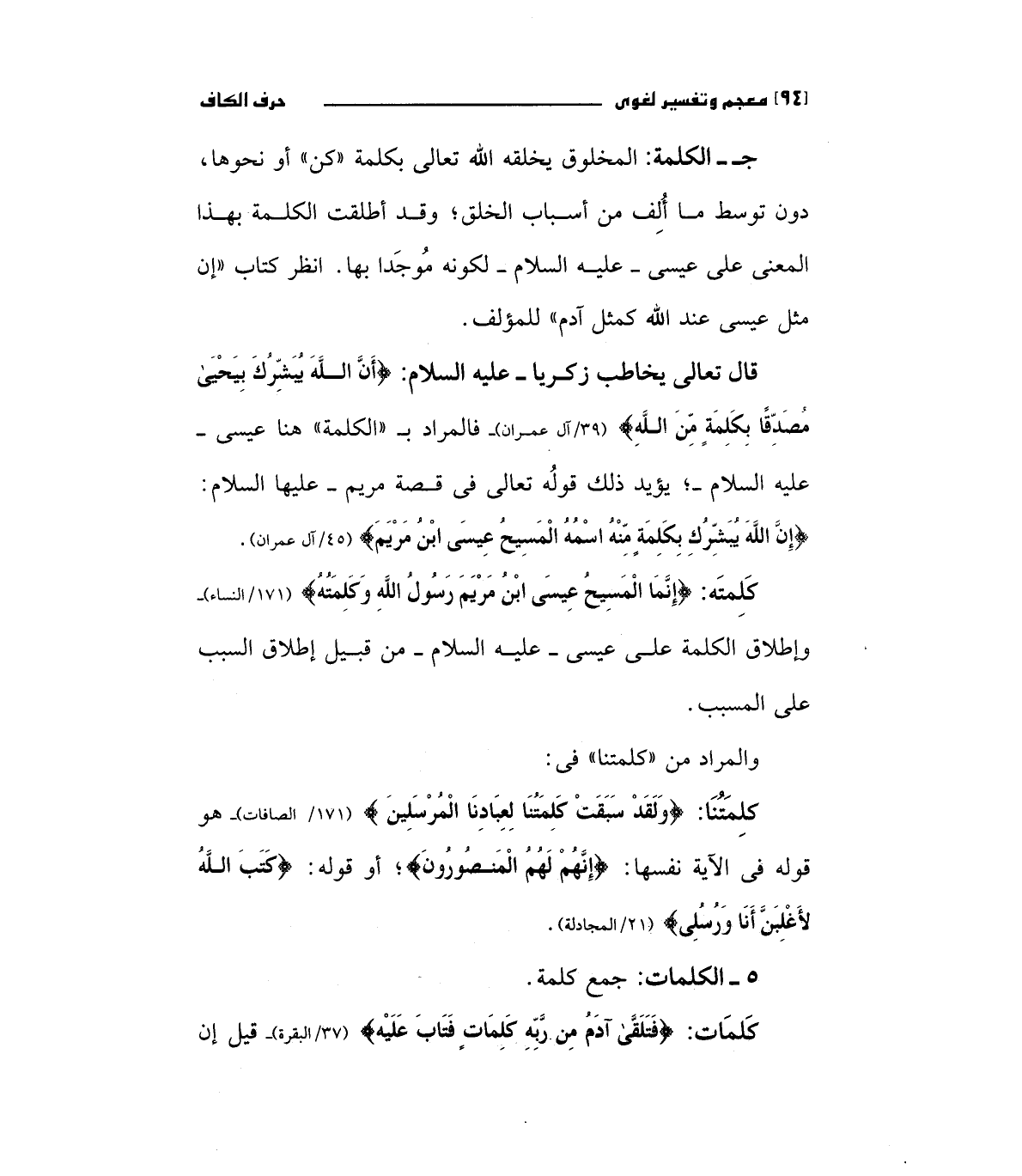 ث الكلمة: المخلوق يخلقه الله تعالي بكلمة " كن" أو نحوها، دون توسط ما ألف من أسباب الخلق، وقد أطلقت الكلمة بهذا المعني علي عيس - عليه السلام - لكونه موجدا بها - انظر كتاب إن مثل عيسي عند الله كمثل آدم للمؤلف.