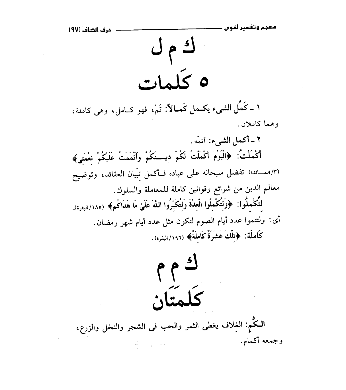 1 - كمل الشئ يكمل كمالا: تم، فهو كامل، وهي كاملة وهما كاملان.