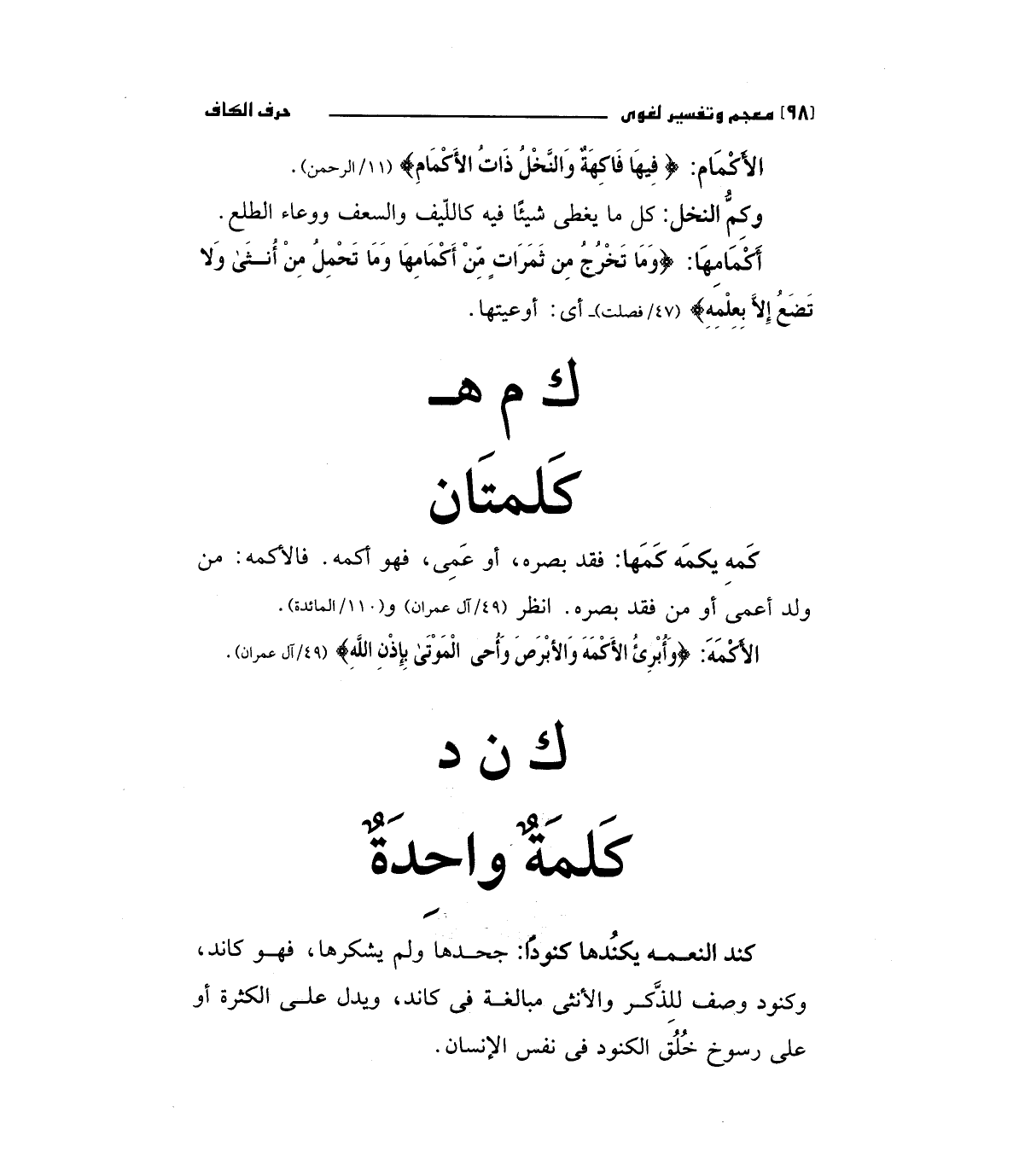 كمه يكمه كمها: فقد بصره، أو عمي، فهو أكمه. فالأكمه: من ولد أعمي أو من فقد بصره. انظر (49/آل عمران " و 110/المائدة "الأكمه: (وَأُبْرِئُ الأَكْمَهَ وَالأَبْرَصَ وَأُحْيِ الْمَوْتَى بِإِذْنِ اللَّهِ) " 49/آل عمران "