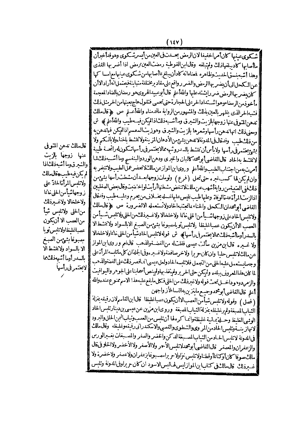 وَقَوْلُهُ وَلَا تَلْبَسُ شَيْئًا مِنْ الْعَصَبِ إلَّا أَنْ يَكُونَ عَصَبًا غَلِيظًا قَالَ ابْنُ الْقَاسِمِ؛ لِأَنَّ رَقِيقَهُ بِمَنْزِلَةِ الثِّيَابِ الْمُصَبَّغَةِ وَلَمْ يُرَ غَلِيظُهُ بِمَنْزِلَةِ الثِّيَابِ الْمُصَبَّغَةِ، وَرَوَى ابْنُ مُزَيْنٍ عَنْ عِيسَى بْنِ دِينَارٍ تَلْبَسُ الْحَادُّ الْوَشْيَ وَالْغَلِيظَ وَحُلَّةً يَمَانِيَّةً غَلِيظَةً، وَإِنَّمَا كُرِهَ لَهَا أَنْ تَلْبَسَ مِنْ الْعَصَبِ وَثِيَابِ الْيَمَنِ الْحُلَلَ وَالْبُرُودَ؛ لِأَنَّهَا زِينَةٌ وَتَلْبَسُ الْحَادُّ مِنْ الْمَرْوِيِّ وَالشَّطَوِيِّ وَالْقَصَبِيِّ والإسكندراني رَقِيقِهِ وَغَلِيظِهِ، وَقَالَ مَالِكٌ فِي الْمُدَوَّنَةِ لَا تَلْبَسُ الْحَادُّ مِنْ الثِّيَابِ الْمُصَبَّغَةِ الدُّكْنَ وَالْخُضْرَ وَالصُّفْرَ وَالْمُصَبَّغَاتِ بِغَيْرِ الْوَرْسِ وَالزَّعْفَرَانِ وَالْمُعَصْفَرَ قَالَ الْقَاضِي أَبُو مُحَمَّدٍ لَا تَلْبَسُ الْأَحْمَرَ وَلَا الْأَصْفَرَ وَلَا الْأَخْضَرَ وَلَا الْخَلُوقِيَّ قَالَ مَالِكٌ صُوفًا كَانَ أَوْ كَتَّانًا أَوْ قُطْنًا وَلَا تَلْبَسُ خَزًّا وَلَا حَرِيرًا مَصْبُوغًا بِزَعْفَرَانٍ وَلَا عُصْفُرٍ وَلَا خُضْرَةٍ وَلَا غَيْرِ ذَلِكَ قَالَ مَالِكٌ فِي كِتَابِ ابْنِ الْمَوَّازِ لَيْسَ لَهَا لُبْسُ الْأَسْوَدِ إنْ كَانَ حَرِيرًا وَفِي الْمُدَوَّنَةِ وَتَلْبَسُ