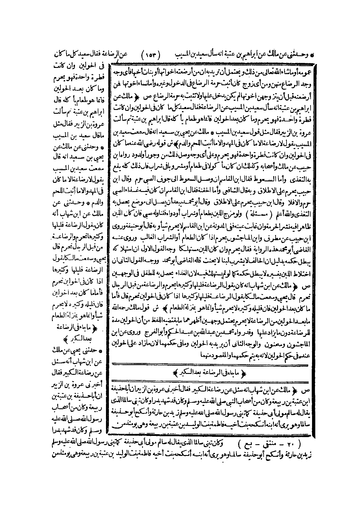 (ص) : (مَالِكٌ عَنْ إبْرَاهِيمَ بْنِ عُتْبَةَ أَنَّهُ سَأَلَ سَعِيدَ بْنَ الْمُسَيِّبِ عَنْ الرَّضَاعَةِ فَقَالَ سَعِيدٌ كُلُّ مَا كَانَ فِي الْحَوْلَيْنِ وَإِنْ كَانَتْ قَطْرَةً وَاحِدَةً فَهُوَ يُحَرِّمُ وَمَا كَانَ بَعْدَ الْحَوْلَيْنِ فَإِنَّمَا هُوَ طَعَامٌ يَأْكُلُهُ قَالَ إبْرَاهِيمُ بْنُ عُتْبَةَ، ثُمَّ سَأَلْت عُرْوَةَ بْنَ الزُّبَيْرِ فَقَالَ مِثْلَ قَوْلِ سَعِيدِ بْنِ الْمُسَيِّبِ مَالِكٌ عَنْ يَحْيَى بْنِ سَعِيدٍ أَنَّهُ قَالَ سَمِعْت سَعِيدَ بْنَ الْمُسَيِّبِ يَقُولُ لَا رَضَاعَةَ إلَّا مَا كَانَ فِي الْمَهْدِ وَإِلَّا مَا أَنْبَتَ اللَّحْمَ وَالدَّمَ) .
