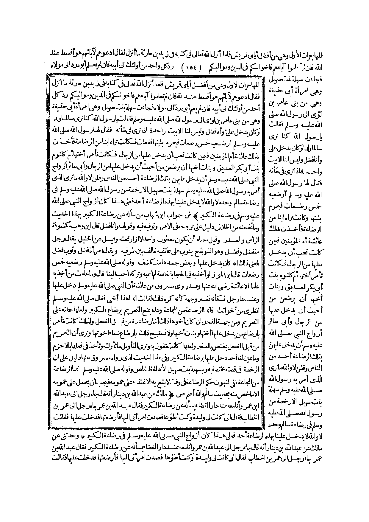 الْمُهَاجِرَاتِ الْأُوَلِ وَهِيَ مِنْ أَفْضَلِ أَيَامَى قُرَيْشٍ، فَلَمَّا أَنْزَلَ اللَّهُ تَعَالَى فِي كِتَابِهِ فِي زَيْدِ بْنِ حَارِثَةَ مَا أَنْزَلَ فَقَالَ {ادْعُوهُمْ لآبَائِهِمْ هُوَ أَقْسَطُ عِنْدَ اللَّهِ فَإِنْ لَمْ تَعْلَمُوا آبَاءَهُمْ فَإِخْوَانُكُمْ فِي الدِّينِ وَمَوَالِيكُمْ} [الأحزاب: 5] رُدَّ كُلُّ أَحَدٍ مِنْ أُولَئِكَ إلَى أَبِيهِ، فَإِنْ لَمْ يُعْلَمْ أَبُوهُ رُدَّ إلَى مَوْلَاهُ فَجَاءَتْ سَهْلَةُ بِنْتُ سُهَيْلٍ وَهِيَ امْرَأَةُ أَبِي حُذَيْفَةَ وَهِيَ مِنْ بَنِي عَامِرِ بْنِ لُؤَيٍّ إلَى رَسُولِ اللَّهِ - صَلَّى اللَّهُ عَلَيْهِ وَسَلَّمَ - فَقَالَتْ يَا رَسُولَ اللَّهِ كُنَّا نَرَى سَالِمًا وَلَدًا وَكَانَ يَدْخُلُ عَلَيَّ وَأَنَا فَضْلٌ وَلَيْسَ لَنَا إلَّا بَيْتٌ وَاحِدٌ فَمَاذَا تَرَى فِي شَأْنِهِ فَقَالَ لَهَا رَسُولُ اللَّهِ - صَلَّى اللَّهُ عَلَيْهِ وَسَلَّمَ - أَرْضِعِيهِ خَمْسَ رَضَعَاتٍ فَيَحْرُمُ بِلَبَنِهَا» فَفَعَلَتْ فَكَانَتْ تَرَاهُ ابْنًا مِنْ الرَّضَاعَةِ فَأَخَذَتْ بِذَلِكَ عَائِشَةُ أُمُّ الْمُؤْمِنِينَ فِيمَنْ كَانَتْ تُحِبُّ أَنْ يَدْخُلَ عَلَيْهَا مِنْ الرِّجَالِ فَكَانَتْ تَأْمُرُ أُخْتَهَا أُمَّ كُلْثُومٍ بِنْتَ أَبِي بَكْرٍ الصِّدِّيقِ وَبَنَاتِ أَخِيهَا أَنْ يُرْضِعْنَ مَنْ أَحَبَّتْ أَنْ يَدْخُلَ عَلَيْهَا مِنْ الرِّجَالِ وَأَبَى سَائِرُ أَزْوَاجِ النَّبِيِّ - صَلَّى اللَّهُ عَلَيْهِ وَسَلَّمَ - أَنْ يَدْخُلَ عَلَيْهِنَّ بِتِلْكَ الرَّضَاعَةِ أَحَدٌ مِنْ النَّاسِ وَقُلْنَ لَا وَاَللَّهِ مَا نَرَى الَّذِي أَمَرَ بِهِ رَسُولُ اللَّهِ - صَلَّى اللَّهُ عَلَيْهِ وَسَلَّمَ - سَهْلَةَ بِنْتَ سُهَيْلٍ إلَّا رُخْصَةً مِنْ رَسُولِ اللَّهِ - صَلَّى اللَّهُ عَلَيْهِ وَسَلَّمَ - فِي رَضَاعَةِ سَالِمٍ وَحْدَهُ لَا وَاَللَّهِ لَا يَدْخُلُ عَلَيْنَا بِهَذِهِ الرَّضَاعَةِ أَحَدٌ فَعَلَى هَذَا كَانَ أَزْوَاجُ النَّبِيِّ - صَلَّى اللَّهُ عَلَيْهِ وَسَلَّمَ - فِي رَضَاعَةِ الْكَبِيرِ)