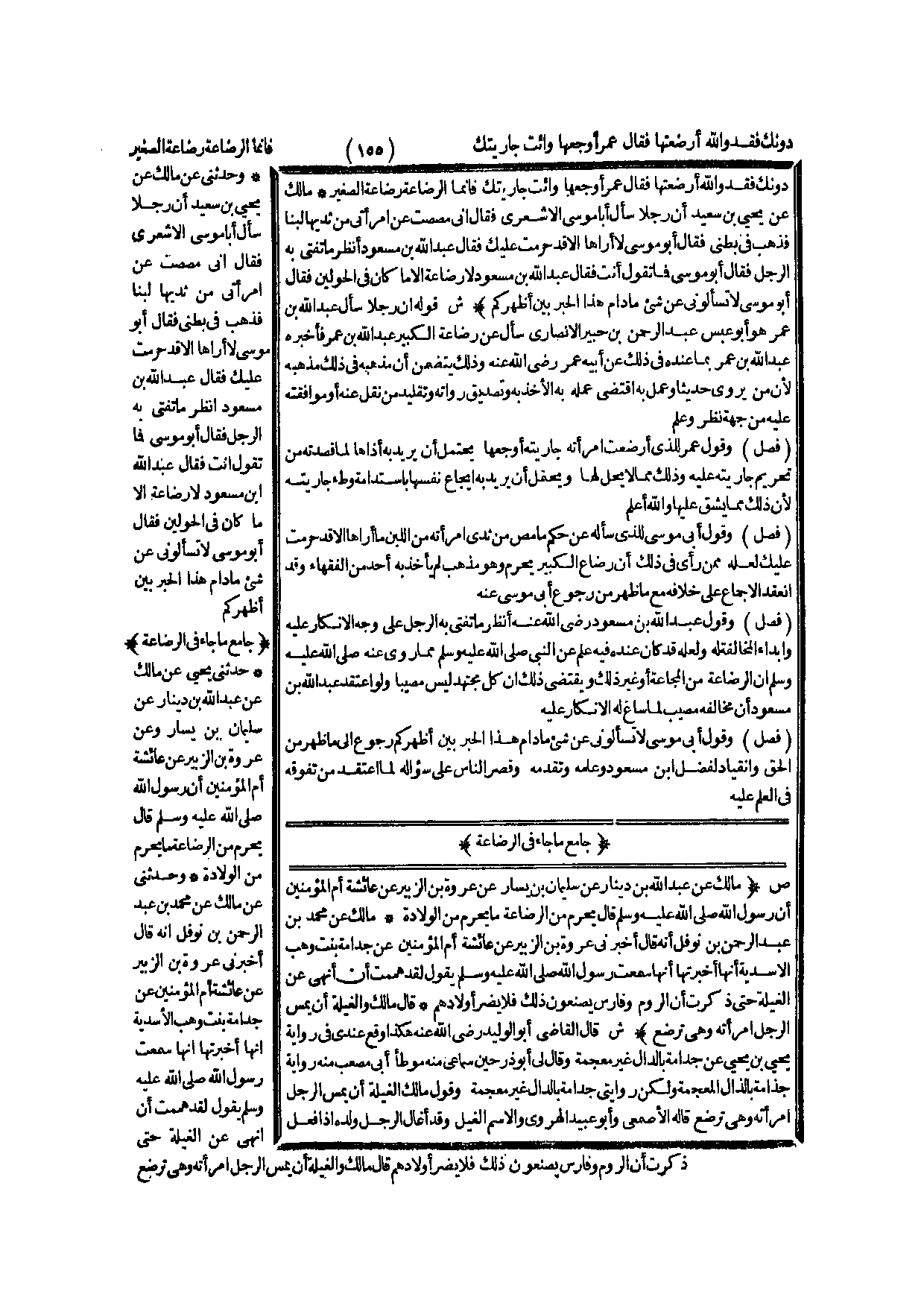 دُونَك فَقَدْ وَاَللَّهِ أَرْضَعْتهَا فَقَالَ عُمَرُ أَوْجِعْهَا وَائْتَ جَارِيَتَك فَإِنَّمَا الرَّضَاعَةُ رَضَاعَةُ الصَّغِيرِ مَالِكٌ عَنْ يَحْيَى بْنِ سَعِيدٍ أَنَّ رَجُلًا سَأَلَ أَبَا مُوسَى الْأَشْعَرِيَّ فَقَالَ إنِّي مَصَصْت عَنْ امْرَأَتِي مِنْ ثَدْيِهَا لَبَنًا فَذَهَبَ فِي بَطْنِي فَقَالَ أَبُو مُوسَى لَا أَرَاهَا إلَّا قَدْ حَرُمَتْ عَلَيْك فَقَالَ عَبْدُ اللَّهِ بْنُ مَسْعُودٍ اُنْظُرْ مَا تُفْتِي بِهِ الرَّجُلَ فَقَالَ أَبُو مُوسَى فَمَا تَقُولُ أَنْتَ فَقَالَ عَبْدُ اللَّهِ بْنُ مَسْعُودٍ لَا رَضَاعَةَ إلَّا مَا كَانَ فِي الْحَوْلَيْنِ فَقَالَ أَبُو مُوسَى لَا تَسْأَلُونِي عَنْ شَيْءٍ مَا دَامَ هَذَا الْحَبْرُ بَيْنَ أَظْهُرِكُمْ) .