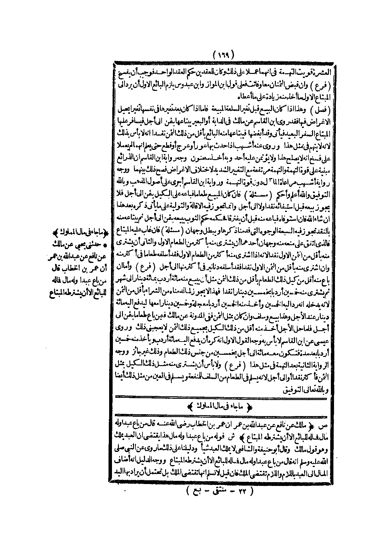 مَا جَاءَ فِي مَالِ الْمَمْلُوكِ (ص) : (مَالِكٌ عَنْ نَافِعٍ عَنْ عَبْدِ اللَّهِ بْنِ عُمَرَ أَنَّ عُمَرَ بْنَ الْخَطَّابِ - رَضِيَ اللَّهُ عَنْهُ - قَالَ مَنْ بَاعَ عَبْدًا وَلَهُ مَالٌ فَمَالُهُ لِلْبَائِعِ إلَّا أَنْ يَشْتَرِطَهُ الْمُبْتَاعُ)