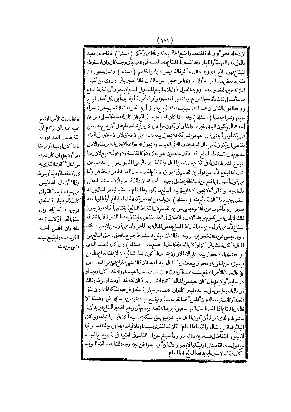 وَهَلْ يَجُوزُ أَنْ يَشْتَرِطَ بَعْضَ مَالِ الْعَبْدِ أَوْ لَا رَوَى ابْنُ حَبِيبٍ عَنْ مَالِكٍ أَنَّ ذَلِكَ غَيْرُ جَائِزٍ وَرُوِيَ عَنْ أَشْهَبَ إجَازَتُهُ حِينَ الْعَقْدِ وَبَعْدَهُ، وَوَجْهُ الْقَوْلِ الْأَوَّلِ أَنَّ مَا تَبِعَ الْمَبِيعَ فِي الْبَيْعِ لَا يَجُوزُ أَنْ يُشْتَرَطَ إتْبَاعُ بَعْضِهِ، أَصْلُ ذَلِكَ مَا تَبِعَهُ بِالشَّرْعِ وَمُقْتَضَى الْعُقْدَةِ وَهُوَ ثَمَرَةٌ مَأْبُورَةٌ أَوْ غَيْرُ مَأْبُورَةٍ فِي أَصْلِ الْمَبِيعِ، وَوَجْهُ الْقَوْلِ الثَّانِي أَنْ هَذَا الْمَالَ يَثْبُتُ بِعَقْدِ الْبَيْعِ فَجَازَ أَنْ يَسْتَحِقَّ بَعْضَهُ كَالثِّيَابِ يَجُوزُ شِرَاءُ جَمِيعِهَا وَشِرَاءُ بَعْضِهَا.
