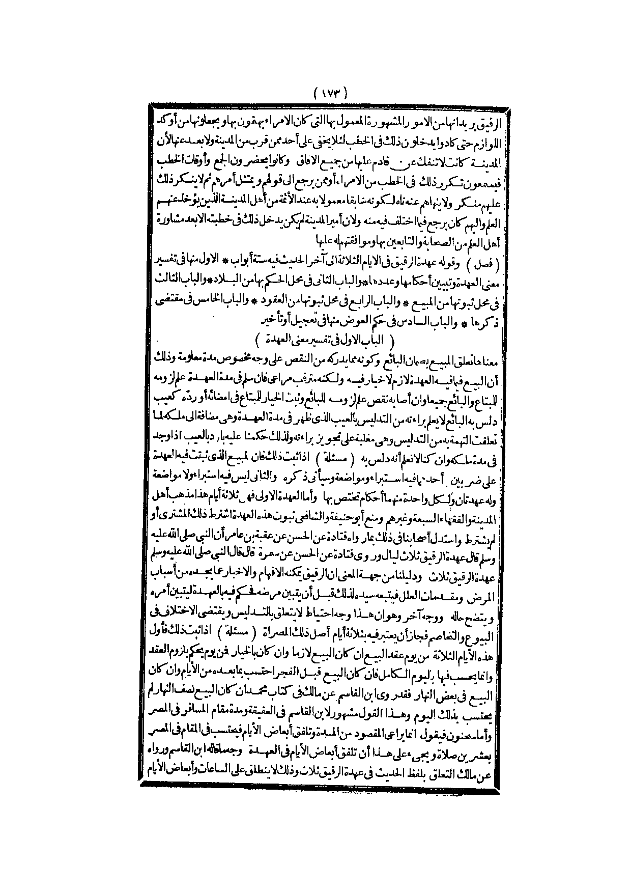وَقَوْلُهُ عُهْدَةُ الرَّقِيقِ فِي الْأَيَّامِ الثَّلَاثَةِ إلَى آخِرِ الْحَدِيثِ فِيهِ سِتَّةُ أَبْوَابٍ الْأَوَّلُ مِنْهَا فِي تَفْسِيرِ مَعْنَى الْعُهْدَةِ وَتَبْيِينِ أَحْكَامِهَا وَعَدَدِهَا وَالْبَابُ الثَّانِي فِي مَحَلِّ الْحُكْمِ بِهَا مِنْ الْبِلَادِ وَالْبَابُ الثَّالِثُ فِي مَحَلِّ ثُبُوتِهَا مِنْ الْمَبِيعِ وَالْبَابُ الرَّابِعُ فِي مَحَلِّ ثُبُوتِهَا مِنْ الْعُقُودِ وَالْبَابُ الْخَامِسُ فِي مُقْتَضَى ذِكْرِهَا وَالْبَابُ السَّادِسُ فِي حُكْمِ الْعِوَضِ مِنْهَا فِي تَعْجِيلٍ أَوْ تَأْخِيرٍ.