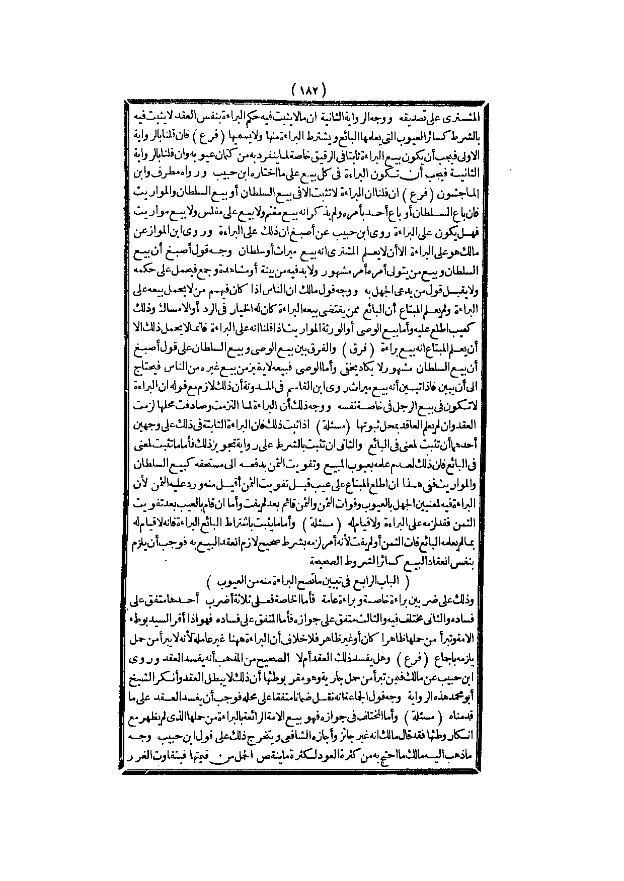 (الْبَابُ الرَّابِعُ فِي تَبْيِينِ مَا تَصِحُّ الْبَرَاءَةُ مِنْهُ مِنْ الْعُيُوبِ) ، وَذَلِكَ عَلَى ضَرْبَيْنِ بَرَاءَةٌ خَاصَّةٌ وَبَرَاءَةٌ عَامَّةٌ، فَأَمَّا الْخَاصَّةُ فَعَلَى ثَلَاثَةِ أَضْرُبٍ: