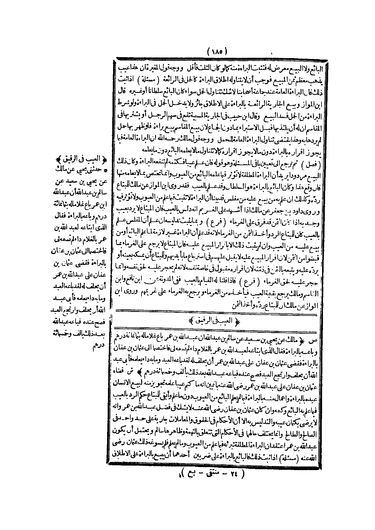 الْعَيْبُ فِي الرَّقِيقِ (ص) : (مَالِكٌ عَنْ يَحْيَى بْنِ سَعِيدٍ عَنْ سَالِمِ بْنِ عَبْدِ اللَّهِ أَنَّ عَبْدَ اللَّهِ بْنَ عُمَرَ بَاعَ غُلَامًا لَهُ بِثَمَانِمِائَةِ دِرْهَمٍ وَبَاعَهُ بِالْبَرَاءَةِ فَقَالَ الَّذِي ابْتَاعَهُ لِعَبْدِ اللَّهِ بْنِ عُمَرَ بِالْغُلَامِ دَاءٌ لَمْ تُسَمِّهِ لِي فَاخْتَصَمَا إلَى عُثْمَانَ بْنِ عَفَّانَ بِالْبَرَاءَةِ فَقَضَى عُثْمَانُ بْنُ عَفَّانَ عَلَى عَبْدِ اللَّهِ بْنِ عُمَرَ أَنْ يَحْلِفَ لَهُ لَقَدْ بَاعَهُ الْعَبْدَ وَمَا بِهِ دَاءٌ يَعْلَمُهُ فَأَبَى عَبْدُ اللَّهِ أَنْ يَحْلِفَ وَارْتَجَعَ الْعَبْدُ فَصَحَّ عِنْدَهُ فَبَاعَهُ عَبْدُ اللَّهِ بَعْدَ ذَلِكَ بِأَلْفٍ وَخَمْسِمِائَةِ دِرْهَمٍ) .