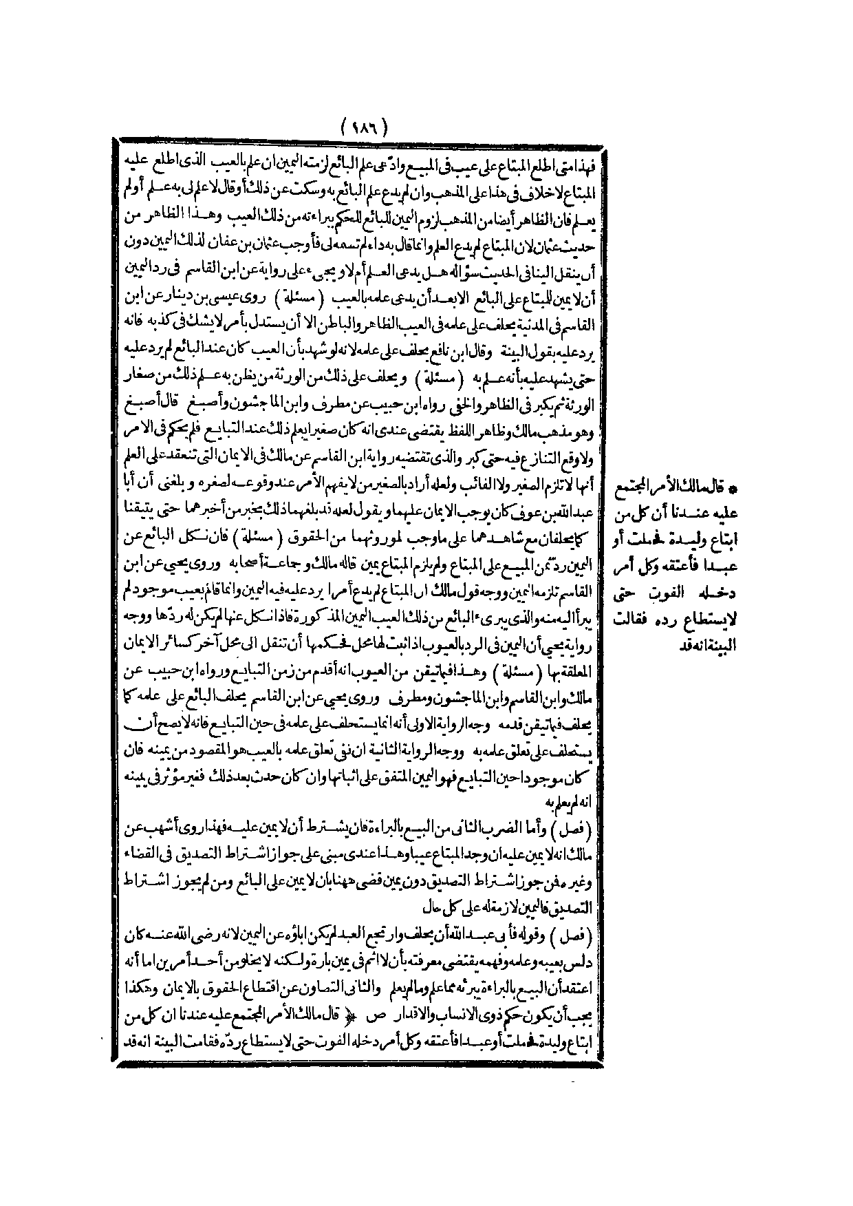 أَحَدُهَا: أَنَّ بَيْعَ الْوَاحِدِ مِنْ اثْنَيْنِ بِمَنْزِلَةِ عَقْدَيْنِ عَلَى رِوَايَةِ ابْنِ الْقَاسِمِ وَبِمَنْزِلَةِ عَقْدٍ وَاحِدٍ عَلَى رِوَايَةِ أَشْهَبَ وَالْفَصْلُ الثَّانِي: أَنَّ الْبَائِعَ إذَا أَوْجَبَ لَهُمَا فَإِنَّ لِأَحَدِهِمَا الْقَبُولَ دُونَ الثَّانِي عَلَى رِوَايَةِ ابْنِ الْقَاسِمِ وَلَيْسَ لَهُ ذَلِكَ عَلَى رِوَايَةِ أَشْهَبَ وَالْفَصْلُ الثَّالِثُ: تَعْيِينُ الْمَسْأَلَةِ.