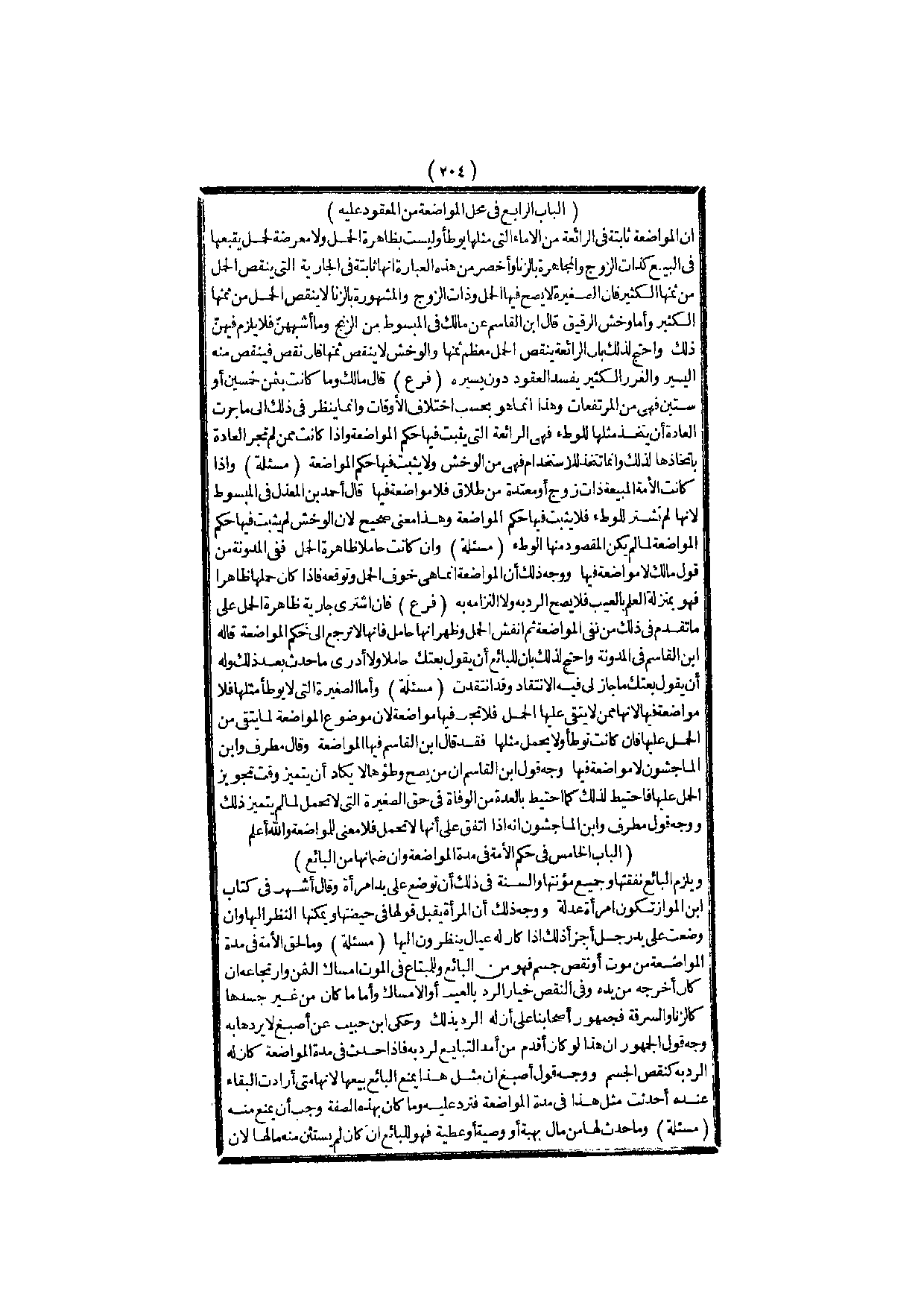 (الْبَابُ الرَّابِعُ فِي مَحَلِّ الْمُوَاضَعَةِ مِنْ الْمَعْقُودِ عَلَيْهِ) إنَّ الْمُوَاضَعَةَ ثَابِتَةٌ فِي الرَّائِعَةِ مِنْ الْإِمَاءِ الَّتِي مِثْلُهَا يُوطَأُ وَلَيْسَتْ بِظَاهِرَةِ الْحَمْلِ وَلَا مُعَرَّضَةٍ لِحَمْلٍ يَتْبَعُهَا فِي الْبَيْعِ كَذَاتِ الزَّوْجِ وَالْمُجَاهِرَةِ بِالزِّنَا وَأَخْصَرُ مِنْ هَذِهِ الْعِبَارَةِ أَنَّهَا ثَابِتَةٌ فِي الْجَارِيَةِ الَّتِي يُنْقِصُ الْحَمْلُ مِنْ ثَمَنِهَا الْكَثِيرَ فَإِنَّ الصَّغِيرَةَ لَا يَصِحُّ فِيهَا الْحَمْلُ وَذَاتُ الزَّوْجِ وَالْمَشْهُورَةُ بِالزِّنَا لَا يُنْقِصُ الْحَمْلُ مِنْ ثَمَنِهَا الْكَثِيرَ، وَأَمَّا وَخْشُ الرَّقِيقِ قَالَ ابْنُ الْقَاسِمِ عَنْ مَالِكٍ فِي الْمَبْسُوطِ مِنْ الزِّنْجِ وَمَا أَشْبَهَهُنَّ فَلَا يَلْزَمُ فِيهِنَّ ذَلِكَ وَاحْتَجَّ لِذَلِكَ بِأَنَّ الرَّائِعَةَ يُنْقِصُ الْحَمْلُ مُعْظَمَ ثَمَنِهَا وَالْوَخْشُ لَا يُنْقِصُ ثَمَنَهَا، فَإِنْ نَقَصَ فَيَنْقُصُ مِنْهُ الْيَسِيرُ وَالْغَرَرُ الْكَثِيرُ يُفْسِدُ الْعُقُودَ دُونَ يَسِيرِهِ.