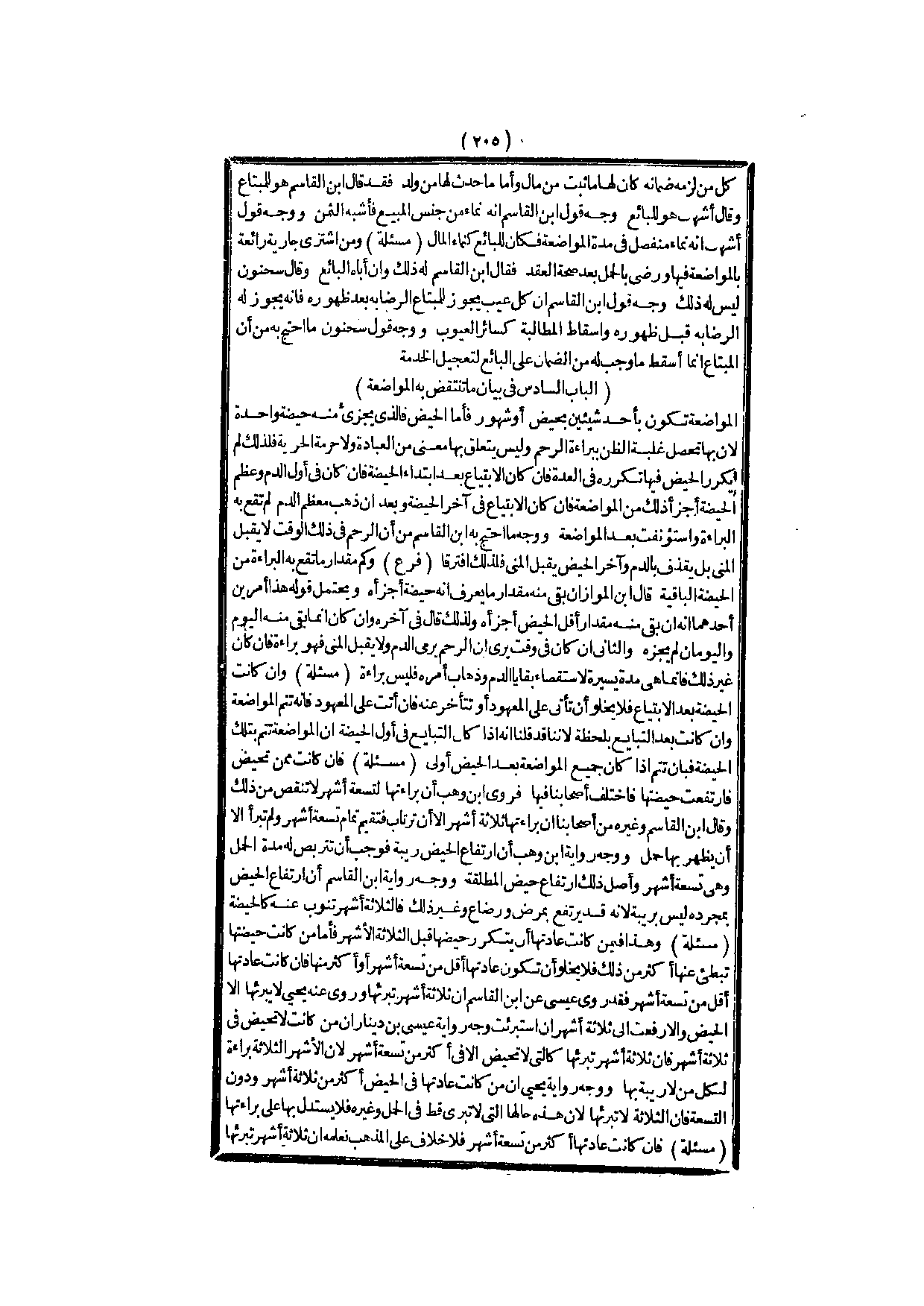 (الْبَابُ السَّادِسُ فِي بَيَانِ مَا تَنْتَقِضُ بِهِ الْمُوَاضَعَةُ) الْمُوَاضَعَةُ تَكُونُ بِأَحَدِ شَيْئَيْنِ بِحَيْضٍ أَوْ شُهُورٍ، فَأَمَّا الْحَيْضُ فَاَلَّذِي يُجْزِئُ مِنْهُ حَيْضَةٌ وَاحِدَةٌ؛ لِأَنَّ بِهَا تَحْصُلُ غَلَبَةُ الظَّنِّ بِبَرَاءَةِ الرَّحِمِ وَلَيْسَ يَتَعَلَّقُ بِهَا مَعْنًى مِنْ الْعِبَادَةِ وَلَا حُرْمَةُ الْحُرِّيَّةِ فَلِذَلِكَ لَمْ يُكَرِّرْ الْحَيْضَ فِيهَا تَكَرُّرَهُ فِي الْعِدَّةِ، فَإِنْ كَانَ الِابْتِيَاعُ بَعْدَ ابْتِدَاءِ الْحَيْضَةِ، فَإِنْ كَانَ فِي أَوَّلِ الدَّمِ وَعِظَمِ الْحَيْضَةِ أَجْزَأَ ذَلِكَ مِنْ الْمُوَاضَعَةِ، فَإِنْ كَانَ الِابْتِيَاعُ فِي آخِرِ الْحَيْضَةِ وَبَعْدَ أَنْ ذَهَبَ مُعْظَمُ الدَّمِ لَمْ تَقَعَ بِهِ الْبَرَاءَةُ وَاسْتُؤْنِفَتْ بَعْدَ الْمُوَاضَعَةِ، وَوَجْهُ مَا احْتَجَّ بِهِ ابْنُ الْقَاسِمِ مِنْ أَنَّ الرَّحِمَ فِي ذَلِكَ الْوَقْتِ لَا يَقْبَلُ الْمَنِيَّ بَلْ يَقْذِفُ بِالدَّمِ وَآخِرُ الْحَيْضِ يَقْبَلُ الْمَنِيَّ فَلِذَلِكَ افْتَرَقَا.