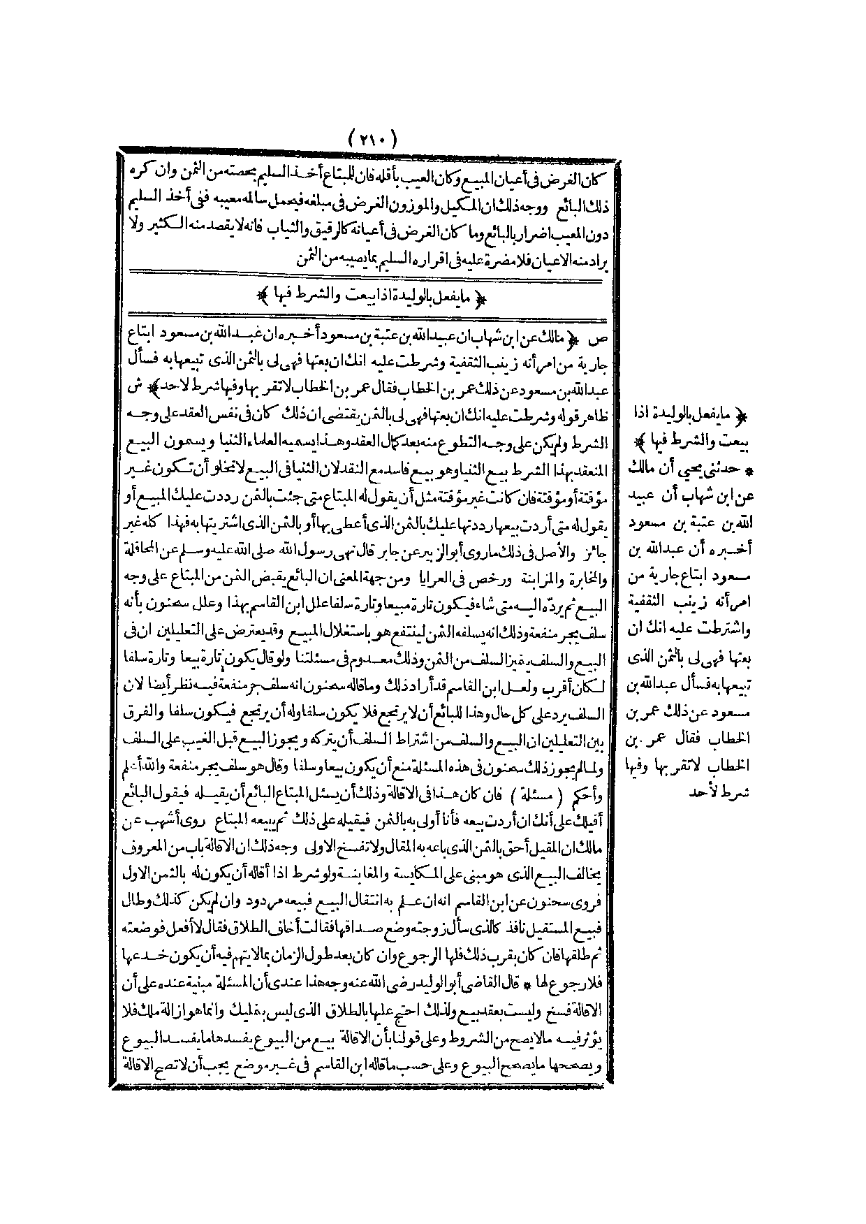 مَا يُفْعَلُ بِالْوَلِيدَةِ إذَا بِيعَتْ وَالشَّرْطُ فِيهَا (ص) : (مَالِكٌ عَنْ ابْنِ شِهَابٍ أَنَّ عُبَيْدَ اللَّهِ بْنَ عُتْبَةَ بْنِ مَسْعُودٍ أَخْبَرَهُ أَنَّ عَبْدَ اللَّهِ بْنَ مَسْعُودٍ ابْتَاعَ جَارِيَةً مِنْ امْرَأَتِهِ زَيْنَبَ الثَّقَفِيَّةِ وَشَرَطَتْ عَلَيْهِ إنَّك إنْ بِعْتهَا فَهِيَ لِي بِالثَّمَنِ الَّذِي تَبِيعُهَا بِهِ فَسَأَلَ عَبْدُ اللَّهِ بْنُ مَسْعُودٍ عَنْ ذَلِكَ عُمَرَ بْنَ الْخَطَّابِ فَقَالَ عُمَرُ بْنُ الْخَطَّابِ لَا تَقْرَبْهَا وَفِيهَا شَرْطٌ لِأَحَدٍ) .