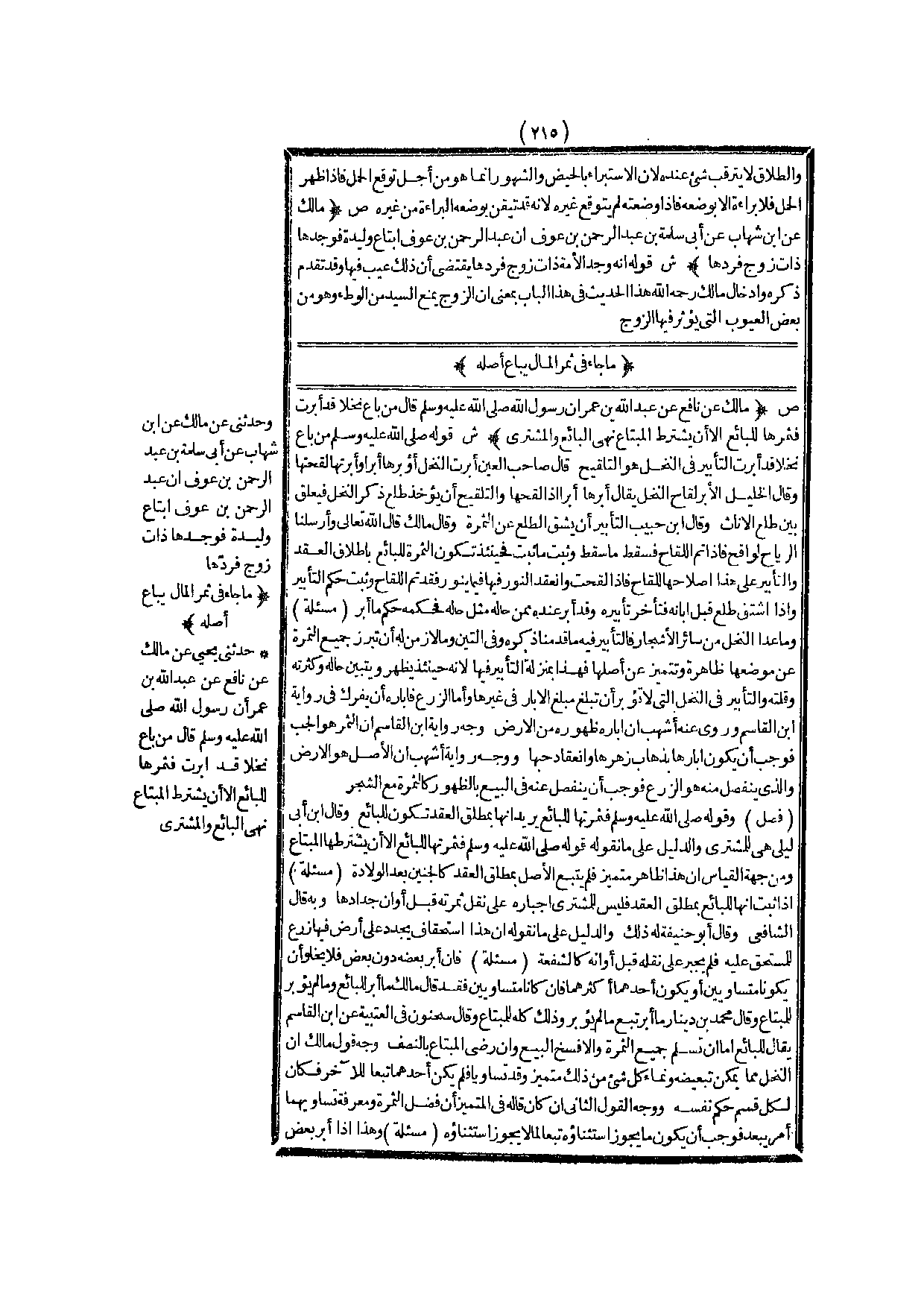 (ص) : (مَالِكٌ عَنْ نَافِعٍ عَنْ عَبْدِ اللَّهِ بْنِ عُمَرَ أَنَّ رَسُولَ اللَّهِ - صَلَّى اللَّهُ عَلَيْهِ وَسَلَّمَ - قَالَ «مَنْ بَاعَ نَخْلًا قَدْ أُبِّرَتْ فَثَمَرُهَا لِلْبَائِعِ إلَّا أَنْ يَشْتَرِطَ الْمُبْتَاعُ نَهَى الْبَائِعَ وَالْمُشْتَرِيَ» )