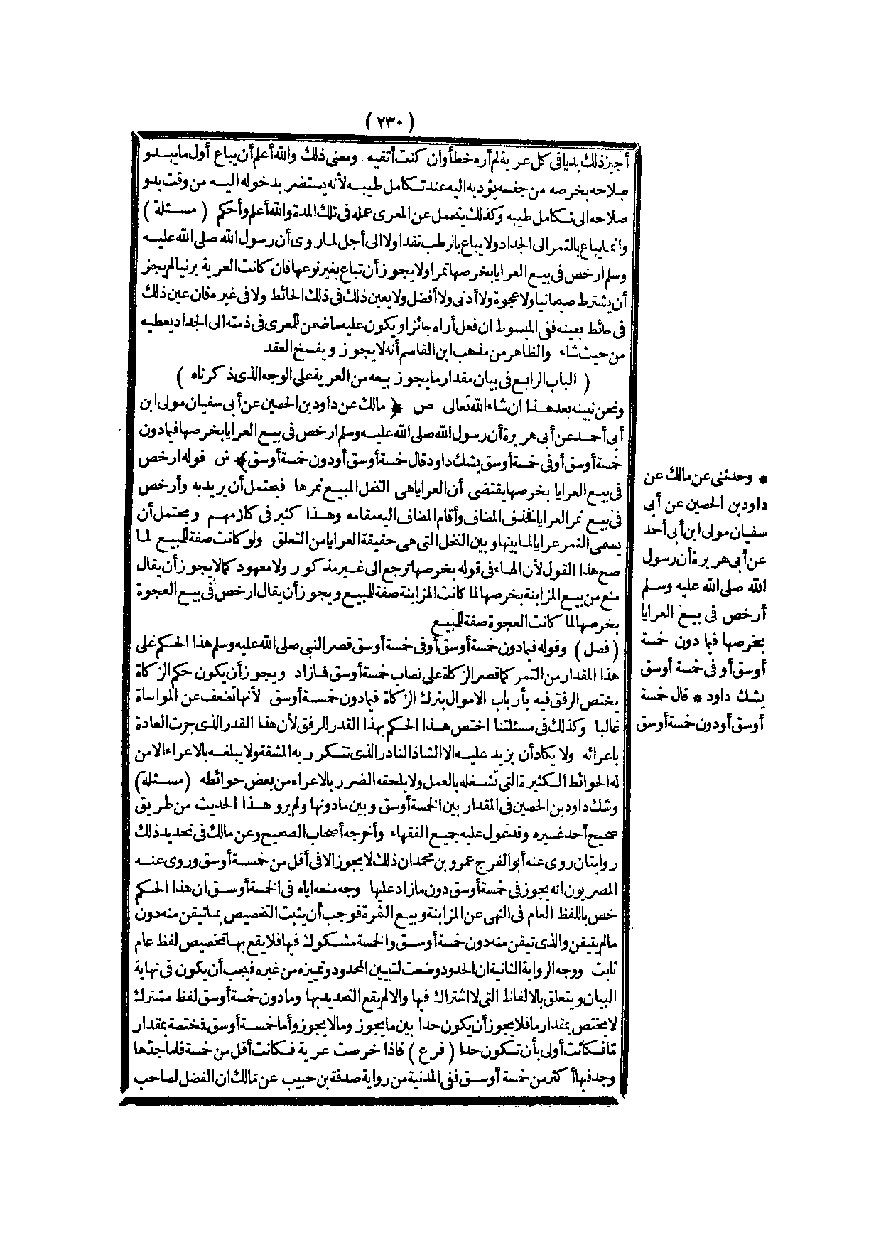 وَشَكَّ دَاوُد بْنُ الْحُصَيْنِ فِي الْمِقْدَارِ بَيْنَ الْخَمْسَةِ أَوْسُقٍ وَبَيْنَ مَا دُونَهَا وَلَمْ يَرْوِ هَذَا الْحَدِيثَ مِنْ طَرِيقٍ صَحِيحٍ أَحَدٌ غَيْرُهُ وَقَدْ عَوَّلَ عَلَيْهِ جَمِيعُ الْفُقَهَاءِ وَأَخْرَجَهُ أَصْحَابُ الصَّحِيحِ وَعَنْ مَالِكٍ فِي تَحْدِيدِ ذَلِكَ رِوَايَتَانِ رَوَى عَنْهُ أَبُو الْفَرْجِ عَمْرُو بْنُ مُحَمَّدٍ أَنَّ ذَلِكَ لَا يَجُوزُ إلَّا فِي أَقَلَّ مِنْ خَمْسَةِ أَوْسُقٍ وَرَوَى عَنْهُ الْمِصْرِيُّونَ أَنَّهُ يَجُوزُ فِي خَمْسَةِ أَوْسُقٍ دُونَ مَا زَادَ عَلَيْهَا وَجْهُ مَنْعِهِ إيَّاهُ فِي الْخَمْسَةِ أَوْسُقٍ أَنَّ هَذَا الْحُكْمَ خُصَّ بِاللَّفْظِ الْعَامِّ فِي النَّهْيِ عَنْ الْمُزَابَنَةِ وَبَيْعِ الثَّمَرَةِ فَوَجَبَ أَنْ يَثْبُتَ التَّخْصِيصُ بِمَا تُيُقِّنَ مِنْهُ دُونَ مَا لَمْ يُتَيَقَّنْ وَاَلَّذِي تُيُقِّنَ مِنْهُ دُونَ خَمْسَةِ أَوْسُقٍ وَالْخَمْسَةُ مَشْكُوكٌ فِيهَا فَلَا يَقَعُ بِهَا تَخْصِيصُ لَفْظٍ عَامٍّ ثَابِتٍ، وَوَجْهُ الرِّوَايَةِ الثَّانِيَةِ أَنَّ الْحُدُودَ وُضِعَتْ لِتَبْيِينِ الْمَحْدُودِ وَتَمْيِيزِهِ مِنْ غَيْرِهِ فَيَجِبُ أَنْ يَكُونَ فِي نِهَايَةِ الْبَيَانِ وَيَتَعَلَّقُ بِالْأَلْفَاظِ الَّتِي لَا اشْتِرَاكَ فِيهَا وَإِلَّا لَمْ يَقَعْ التَّحْدِيدُ بِهَا وَمَا دُونَ خَمْسَةِ أَوْسُقٍ لَفْظٌ مُشْتَرِكٌ لَا يَخْتَصُّ بِمِقْدَارٍ مَا فَلَا يَجُوزُ أَنْ يَكُونَ حَدًّا بَيْنَ مَا يَجُوزُ وَمَا لَا يَجُوزُ، وَأَمَّا خَمْسَةُ أَوْسُقٍ فَمُخْتَصَّةٌ بِمِقْدَارٍ مَا فَكَانَتْ أَوْلَى بِأَنْ تَكُونَ حَدًّا.