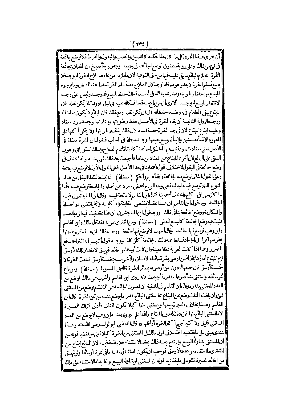 ـــــــــــــــــــــــــــــQأَنْ يَجْرِيَ هَذَا الْمَجْرَى كُلُّ مَا كَانَ هَذَا حُكْمَهُ كَالْقَصِيلِ وَالْقَصَبِ وَالْبُقُولِ وَالْقَرَطِ فَلَا تُوضَعُ جَائِحَةٌ فِي شَيْءٍ مِنْ ذَلِكَ وَعَلَى رِوَايَةِ سَحْنُونٍ تُوضَعُ الْجَائِحَةُ فِي جَمِيعِهِ وَجْهُ رِوَايَةِ أَصْبَغَ أَنَّ الضَّمَانَ بِجَائِحَةِ الثَّمَرَةِ إنَّمَا يَلْزَمُ الْبَائِعَ مَا بَقِيَ عَلَيْهِ فِيهَا مِنْ حَقِّ التَّوْفِيَةِ؛ لِأَنَّ مَا يَلْزَمُهُ مِنْ تَمَامِ صَلَاحِ الثَّمَرَةِ لَمْ يُوجَدْ فَلَا يَصِحُّ تَسْلِيمُ الثَّمَرَةِ إلَّا بَعْدَ وُجُودِهِ فَإِذَا وُجِدَ كَمَالُ الصَّلَاحِ بَعْدَ تَسْلِيمِ الثَّمَرَةِ سَقَطَ عَنْهُ الضَّمَانُ وَمَا يَرْجُوهُ الْمُبْتَاعُ مِنْ حِفْظِ رُطُوبَتِهِ وَنَضَارَتِهِ بِبَقَائِهِ فِي أَصْلِهِ فَذَلِكَ حِفْظٌ لِمَبِيعٍ قَدْ وُجِدَ وَلَيْسَ عَلَى وَجْهِ الِانْتِظَارِ لِمَبِيعٍ لَمْ يُوجَدْ أَلَا تَرَى أَنَّ مَنْ بَاعَ مِنْهُ قَمْحًا فَكَالَهُ عَلَيْهِ فِي لَيْلٍ أَوْ وَقْتٍ لَا يُمْكِنُ نَقْلُهُ فَإِنَّ الْمُبْتَاعَ يُبْقِي الطَّعَامَ فِي مَوْضِعِهِ حِفْظًا لَهُ إلَى أَنْ يُمْكِنَ نَقْلُهُ وَمَعَ ذَلِكَ فَإِنَّ الْبَائِعَ لَا يَكُونُ ضَامِنًا لَهُ.