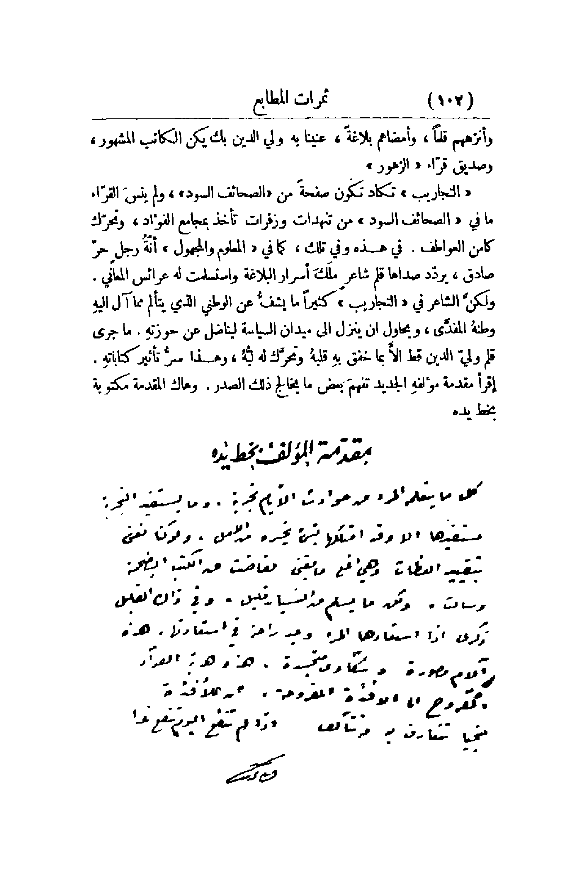 وأنزههم قلماً , وأمضاهم بلاغةً , عنينا به ولي الدين بك يكن الكاتب المشهور , وصديق قرّاء الزهور. التجاريب تكاد تكون صفحةً من الصحائف السود ولم ينسَ القرّاء ما في الصحائف السود من تنهدات وزفرات تأخذ بمجامع الفؤاد , وتحرّك كامن العواطف. في هذه وفي تلك , كما في المعلوم والمجهول أنّهُ رجلٍ حرّ صادق , يردّد صداها قلم شاعرٍ ملَكَ أسرار البلاغة واستسلمت له عرائس المعاني. ولكنَّ الشاعر في التجاريب كثيراً ما يشفُّ عن الوطني الذي يتألم مما آل إليه وطنهُ المفدَّي , ويحاول أن ينزل إلى ميدان السياسة ليناضل عن حوزتهِ. ما جرى قلم وليّ الدين قط إلاَّ بما خفق بهِ قلبهُ وتحرَّك له لبُّهُ , وهذا سرُّ تأثير كتاباتهِ. أقرأ مقدمة مؤلفهِ الجديد تفهمَ بعض ما يخالج ذلك الصدر. وهاك المقدمة مكتوبة بخط يده.