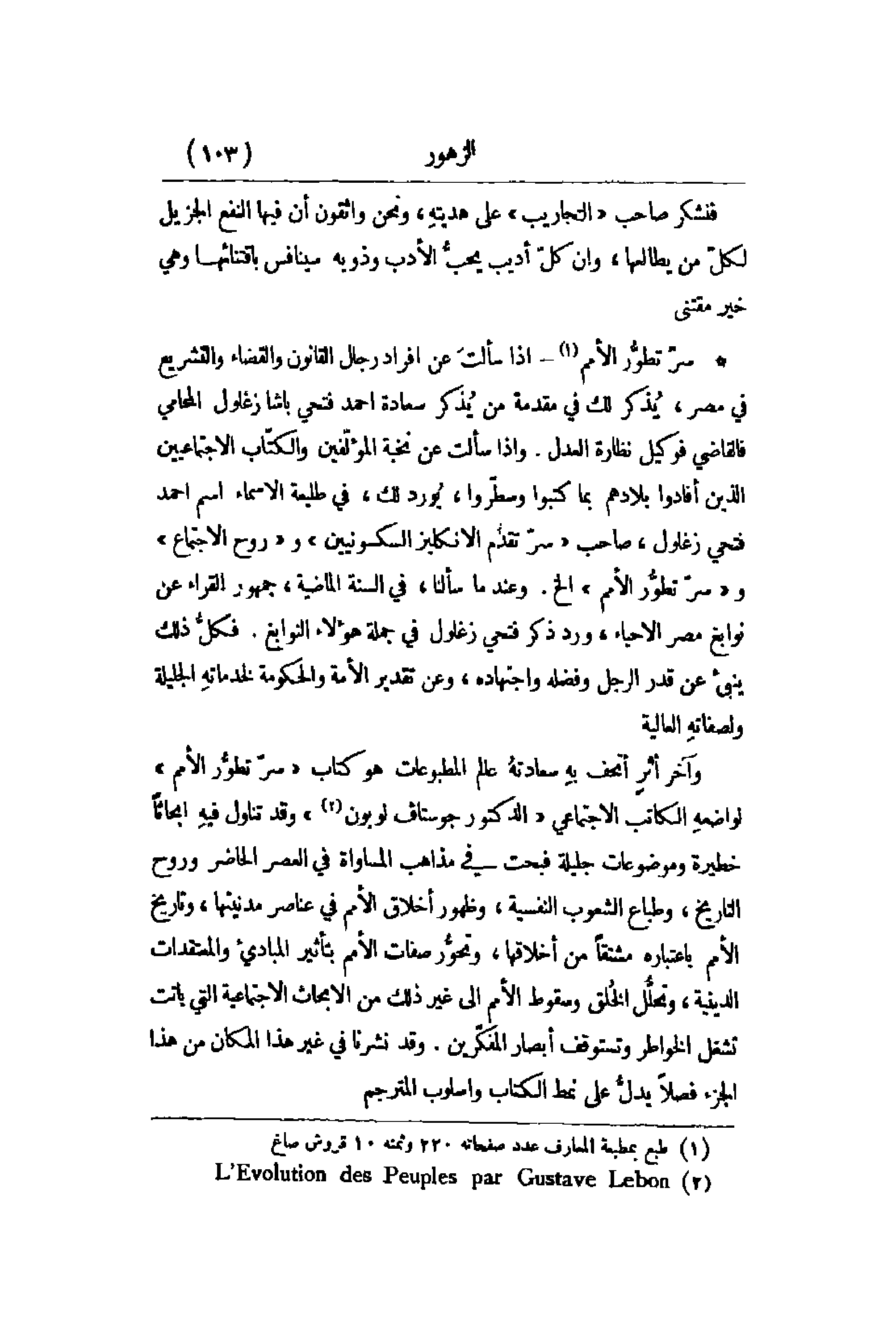 وسطّروا , يُورد لك , في طليعة الأسماء اسم أحمد فتحي زغلول , صاحب سرّ تقدم الانكليز السكونيين وروح الاجتماع وسرّ تطوُّر الأمم الخ. وعندما سألنا , في السنة الماضية , جمهور القراء عن نوابغ مصر الأحياء , ورد ذكر فتحي زغلول في جملة هؤلاء النوابغ. فكلُّ ذلك ينبئ عن قدر الرجل وفضله واجتهاده , وعن تقدير الأمة والحكومة لخدماتهِ الجليلة ولصفاتهِ العالية. وآخر أثرٍ أتحف بهِ سعادتهُ عالم المطبوعات هو كتاب سرّ تطوُّر الأمم لواضعهِ الكاتب الاجتماعي الدكتور جوستاف لوبون وقد تناول فيهِ أبحاثاً خطيرة وموضوعات جليلة فبحت في مذاهب المساواة في العصر الحاضر وروح التاريخ , وطباع الشعوب النفسية , وظهور أخلاق الأمم في عناصر مدنيتها , وتاريخ الأمم باعتباره مشتقاً من أخلاقها؛ وتحوُّر صفات الأمم بتأثير المبادئ والمعتقدات الدينية , وتحلُّل الخُلق وسقوط الأمم إلى غير ذلك من الأبحاث الاجتماعية التي باتت تشغل الخواطر وتستوقف أبصار المفكّرين. وقد نشرنا في غير هذا المكان من هذا الجزء فصلاً يدلُّ على نمط الكتاب وأسلوب المترجم.