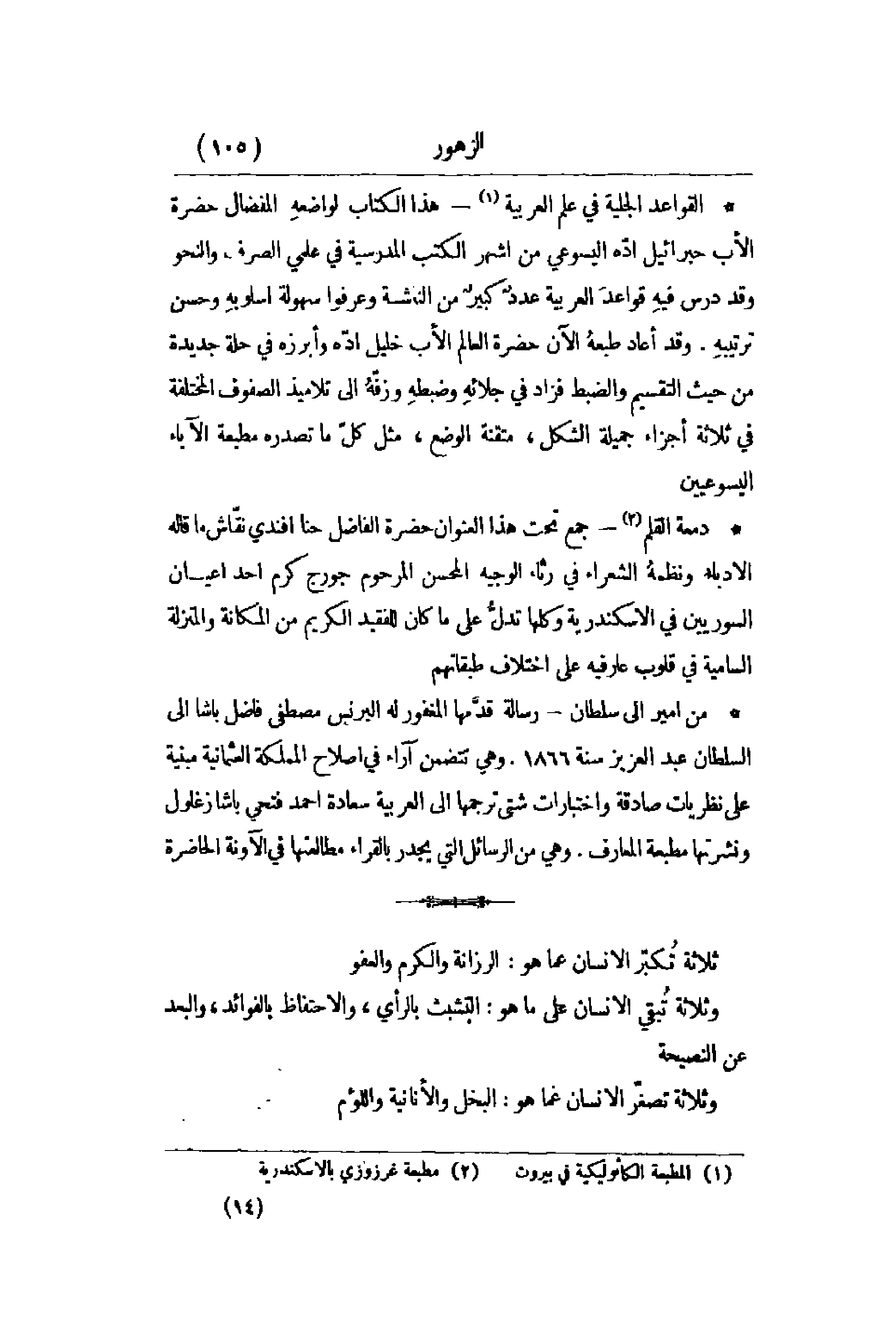 القواعد الجلية في علم العربية - هذا الكتاب لواضعهِ المفضال حضرة الأب حبرائيل أدّه اليسوع من أشهر الكتب المدرسية في علمي الصرف والنحو. وقد درس فيهِ قواعد العربية عددٌ كبيرٌ من الناشئة وعرفوا سهولة أسلوبهِ وحسن ترتيبهِ. وقد أعاد طبعهُ الآن حضرة العالم الأب خليل أدّه وأبرزه في حلة جديدة من حيث التقسيم والضبط فزاد في جلائهِ وضبطهِ وزقّهُ إلى تلاميذ الصفوف المختلفة في ثلاثة أجزاء جميلة الشكل , متقنة الوضع , مثل كلّ ما تصدره مطبعة الآباء اليسوعيين.