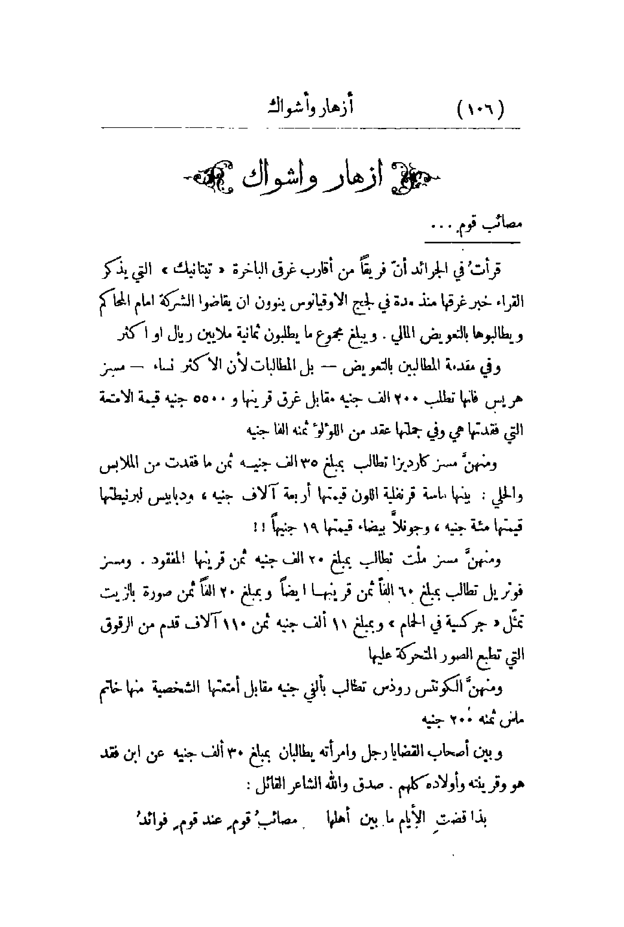قرأتُ في الجرائد أنّ فريقاً من أقارب غرقي الباخرة تيتانيك التي يذكر القراء خبر غرقها منذ مدة في لجج الأوقيانوس ينوون أن يقاضوا الشركة أمام المحاكم ويطالبوها بالتعويض المالي. ويبلغ مجموع ما يطلبون ثمانية ملايين ريال أو أكثر. وفي مقدمة المطالبين بالتعويض - بل المطالبات لأن الأكثر نساء - مسز هريس فإنها تطلب 200 ألف جنيه مقابل غرق قرينها و 5500 جنيه قيمة الأمتعة التي فقدتها هي وفي جملتها عقد من اللؤلؤ ثمنه ألفا جنيه. ومنهنَّ مسز كاريزا تطالب بمبلغ 35 ألف جنيه ثمن ما فقدت من الملابس والحلي: بينها ماسة قرنفلية اللون قيمتها أربعة ألاف جنيه , ودبابيس لبرنيطتها قيمتها مئة جنيه , وجونلاَّ بيضاء قيمتها 19 جنيهاً!! ومنهنَّ مسز ملْت تطالب بمبلغ 20 ألف جنيه ثمن قرينها المفقود. ومسز فوتريل تطالب بمبلغ 60 ألفاً ثمن قرينها أيضاً وبمبلغ 20 ألفاً ثمن صورة بالزيت تمثّل جركسية في الحمام وبمبلغ 11 ألف جنيه ثمن 110 ألاف قدم من الرقوق التي تطبع الصور المتحركة عليها. ومنهنَّ الكونتس روذس تطالب بألفي جنيه مقابل أمتعتها الشخصية منها خاتم ماس ثمنه 200 جنيه. وبين أصحاب القضايا رجل وامرأته يطالبان بمبلغ 30 ألف جنيه عن ابن فقد هو وقرينته وأولاده كلهم. صدق والله الشاعر القائل: