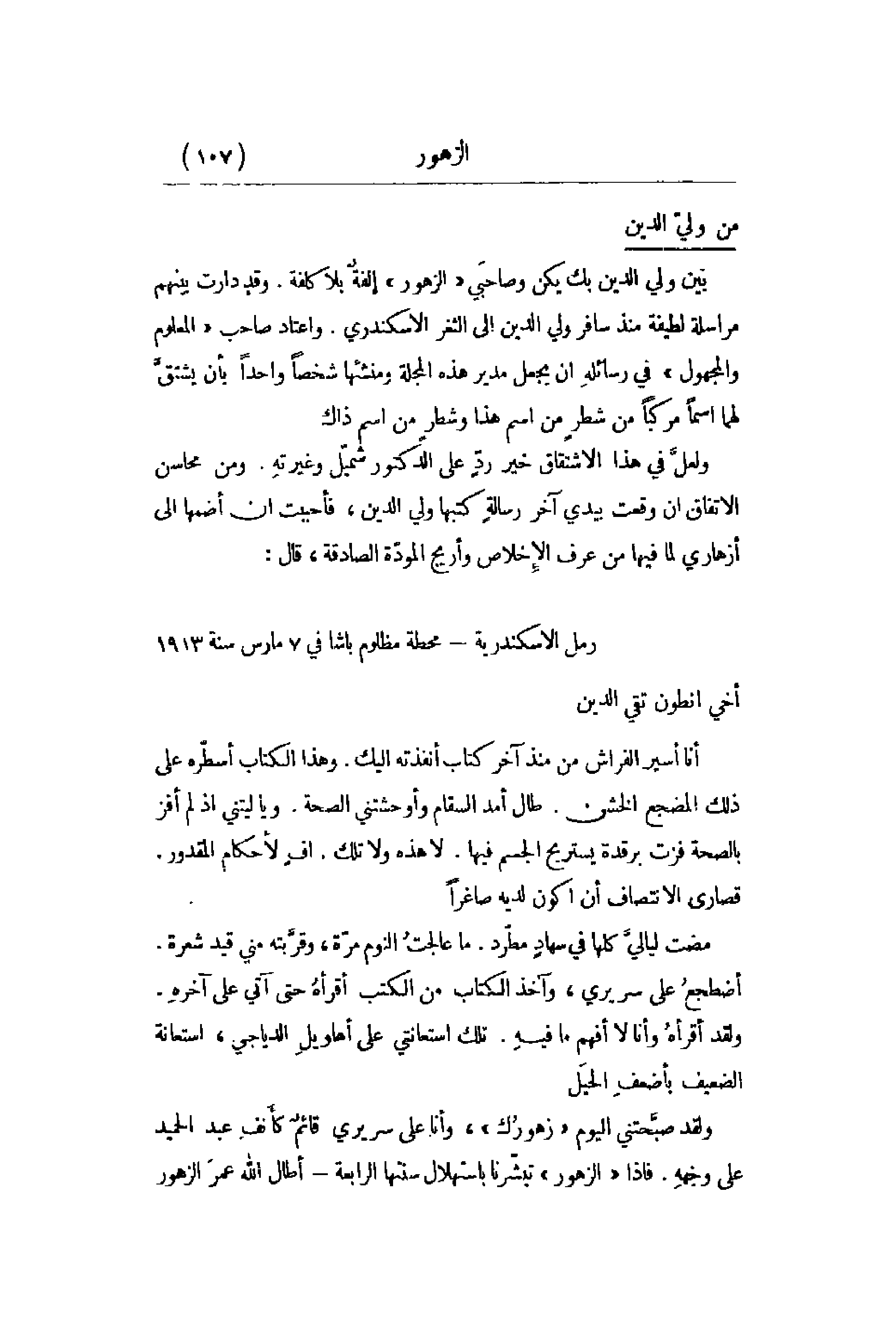 بين ولي الدين بك يكن وصاحَبي الزهور ألفةٌ بلا كلفة. وقد دارت بينهم مراسلة لطيفة منذ سافر ولي الدين إلى الثغر الإسكندري. واعقاد صاحب المعلوم والمجهول في رسائلهِ أن يجعل مدير هذه المجلة شخصاً واحداً بأن يشتقَّ لهما اسماً من شطرٍ من اسم هذا وشطرٍ من اسم ذاك. ولعلَّ في هذا الاشتقاق خير ردٍّ على الدكتور وغيرته. ومن محاسن الاتفاق أن وقعت بيدي آخر رسالةٍ كتبها ولي الدين , فأحببت أن أضمها إلى أزهاري لما فيها من عرف الإِخلاص وأريج المودّة الصادقة , قال: