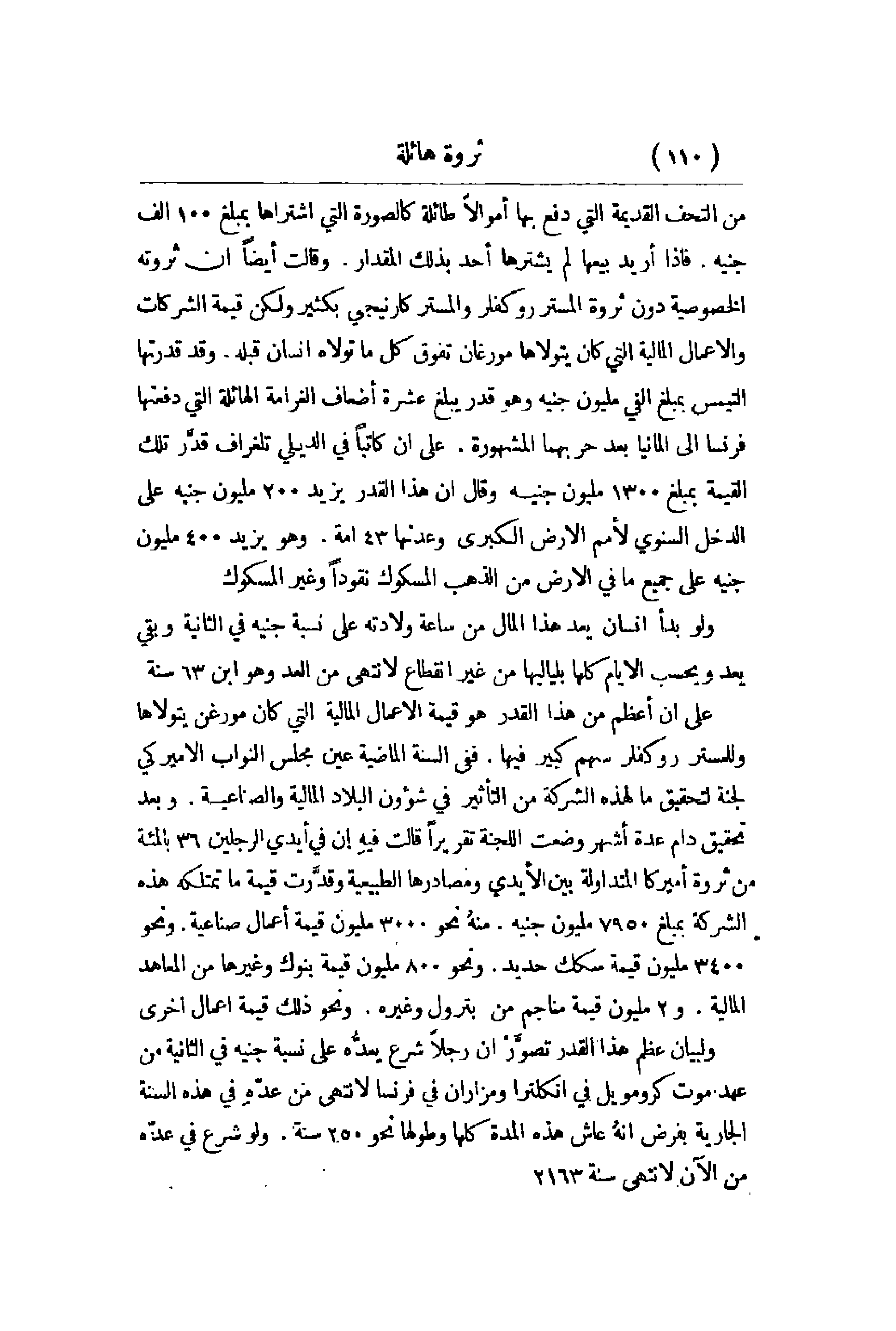 من التحف القديمة التي دفع بها أموالاً طائلة كالصورة التي اشتراها بمبلغ 100 ألف جنيه. فإذا أريد بيعها لم يشترها أحد بذلك المقدار. وقالت أيضاً أن ثروته الخصوصية دون ثروة المسترروكفلر والمستر كارنيجي بكثير ولكن قيمة الشركات والأعمال المالية التي كان يتولاها مورغان تفوق كل ماتولاه إنسان قبله. وقد قدرتها التيمس بمبلغ ألفي مليون جنيه وهو قدر يبلغ عشرة أضعاف الغرامة الهائلة التي دفعتها فرنسا إلى ألمانيا بعد حربها المشهورة. على أن كاتباً في الديلي تلغراف قدَّر تلك القيمة بمبلغ 1300 مليون جنيه وقال أن هذا القدر يزيد 200 مليون جنيه على الدخل السنوي لأمم الأرض الكبرى وعدتها 43أمة. وهو يزيد 400 مليون جنيه على جميع ما في الأرض من الذهب المسكوك نقوداً وغير المسكوك. ولو بدأ إنسان يعد هذا المال من ساعة ولادته على نسبة جنيه في الثانية وبقي يعد ويحسبّ الأيام كلها بلياليها من غير انقطاع لانتهى من العد وهو ابن 63سنة. على أن أعظم من هذا القدر هو قيمة الأعمال المالية التي كان مورغن يتولاها وللمستر روكفلر سهم كبير فيها. ففي السنة الماضية عين مجلس النواب الأميركي لجنة لتحقيق ما لهذه الشركة من التأثير في شؤون البلاد المالية والصناعية. وبعد تحقيق دام عدة أشهر وضعت اللجنة تقريراً قالت فيهَِ أن في أيدي الرجلين 36 بالمئة من ثروة أميركا المتداولة بين الأيدي ومصادرها الطبيعية وقدَّرت قيمة ما تمتلكه هذه الشركة بمبلغ 7950 مليون جنيه. منهُ نحو 3000 مليون قيمة أعمال صناعية. ونحو 3400 مليون قيمة سكك حديد. ونحو 800 مليون قيمة بنوك وغيرها من المعاهد المالية. و2 مليون قيمة مناجم من بترول وغيره. ونحو ذلك قيمة أعمال أخرى. ولبيان عظم هذا القدر تصوَّرْ أن رجلاً شرع يعدُّه على نسبة جنيه في الثانية من عهد موت كرومويل في انكلترا ومزاران في فرنسا لانتهى من عدّهِ في هذه السنة الجارية بفرض أنهُ عاش هذه المدة كلها وطولها نحو 250 سنة. ولو شرع في عدّه من الآن لانتهى سنة