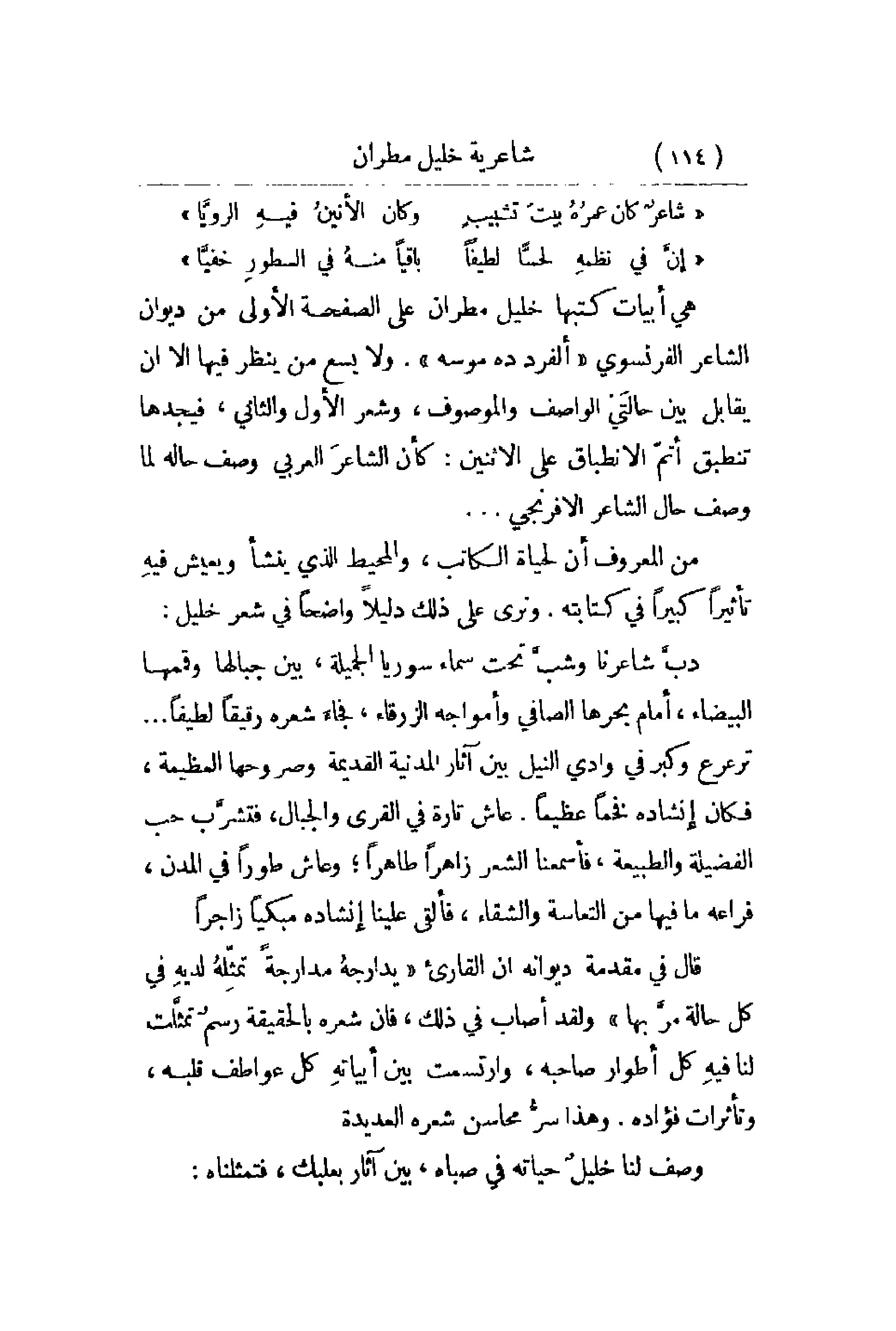 هي أبيات كتبها خليل مطران على الصفحة الأولى من ديوان الشاعر الفرنسوي ألفرد ده موسه ولا يسع من ينظر فيها إلا أن يقابل بين حالَتيْ الواصف والموصوف , وشعر الأول والثاني , فيجدها تنطبق أتمّ الانطباق على الاثنين: كأن الشاعرَ العربي وصف حاله لما وصف حال الشاعر الإفرنجي. . . من المعروف أن لحياة الكاتب , والمحيط الذي ينشأ ويعيش فيهِ تأثيراً كبيراً في كتابته. ويرى على ذلك دليلاً واضحاً في شعر خليل: دبَّ شاعرنا وشبَّ تحت سماء سوريا الجميلة , بين جبالها وقممها البيضاء , أمام بحرها الصافي وأمواجه الزرقاء , فجاءَ شعره رقيقاً لطيفاً. . . ترعرع وكبر في وادي النيل بين آثار المدينة القديمة وصروحها العظيمة , فكان إنشاده فخماً عظيماً. عاش تارة في القرى والجبال , فتشرَّب حب الفضيلة والطبيعة , فأسمعنا الشعر زاهراً طاهراً؛ وعاش طوراً في المدن , فراعه ما فيها من التعاسة والشقاء , فألقى علينا إنشاده مبكياً زاجراً. قال في مقدمة ديوانه أن القارئ يدارجهُ مدراجةً تمثِّلهُ لديهِ في كل حالة مرَّ بها ولقد أصاب في ذلك , فإن شعره بالحقيقة رسمٌ تمثَّلت لنا فيهِ كل أطوار صاحبه , وارتسمت بين أبياتهِ كل عواطف قلبه , وتأثرات فؤاده. وهذا سرُّ محاسن شعره العديدة. وصف لنا خليلٌ حياته في صبا , بين آثار بعلبك , فتمثلناه: