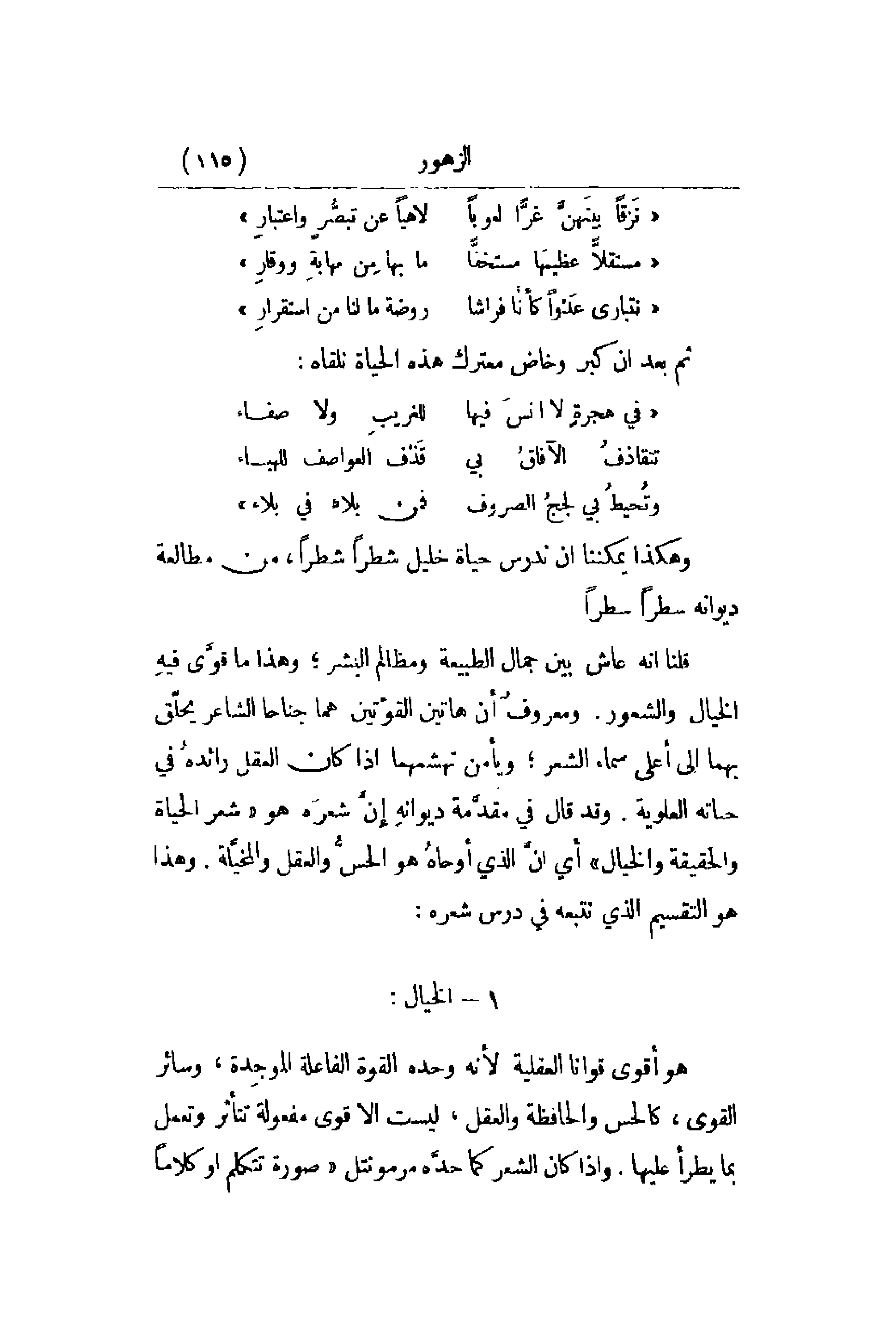 وهكذا يمكننا أن ندرس حياة خليل شطراً شطراً , من مطالعة ديوانه سطراً سطراً. قلنا أنه عاش بين جمال الطبيعة ومظالم البشر؛ وهذا ما قوَّي فيهِ الخيال والشعور. ومعروفٌ أن هاتين القوّتين هما جناحا الشاعر يحلّق بهما إلى أعلى سماء الشعر؛ ويأمن تهشمهما إذا كان العقل رائدهُ في حياته العلوية. وقد قال في مقدَّمة ديوانهِ إنّ شعره هو شعر الحياة والحقيقة والخيال أي أنَّ الذي أوحاهُ هو الحسُّ والعقل والمخيَّلة. وهذا هو التقسيم الذي نتبعه في درس شعره: