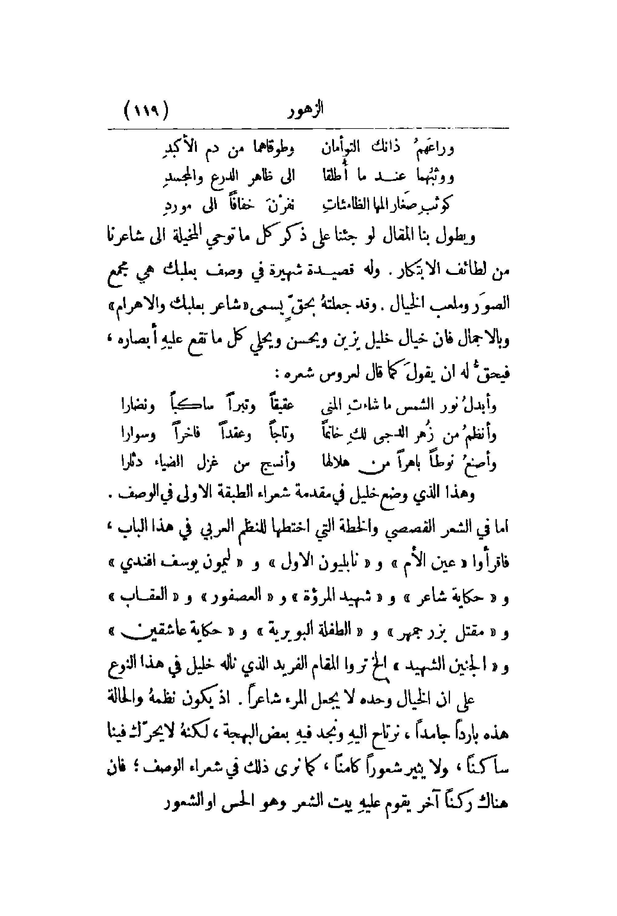 وهذا الذي وضع خليل في مقدمة شعراء الطبقة الأولى في الوصف. أما في الشعر القصصي والخطة التي اختطها للنظم العربي في هذا الباب , فاقرأوا عين الأم ونابوليون الأول وليمون يوسف أفندي وحكاية شاعر وشهيد المرؤة والعصفور والعقاب ومقتل بزرجمهر والطفلة البويرية وحكاية عاشقين والجنين الشهيد الخ تروا المقام المرء شاعراً. إذ يكون نظمهُ والحالة هذه بارداً جامداً , نرتاح إليهِ ونجد فيهِ بعض البهجة , لكنهُ لا يحرّك فينا ساكناً ,. ولا يثير شعوراً كامناً , كما نرى ذلك في شعراء الوصف؛ فإن هناك ركناً آخر يقوم عليهِ بيت الشعر وهو الحس أو الشعور.