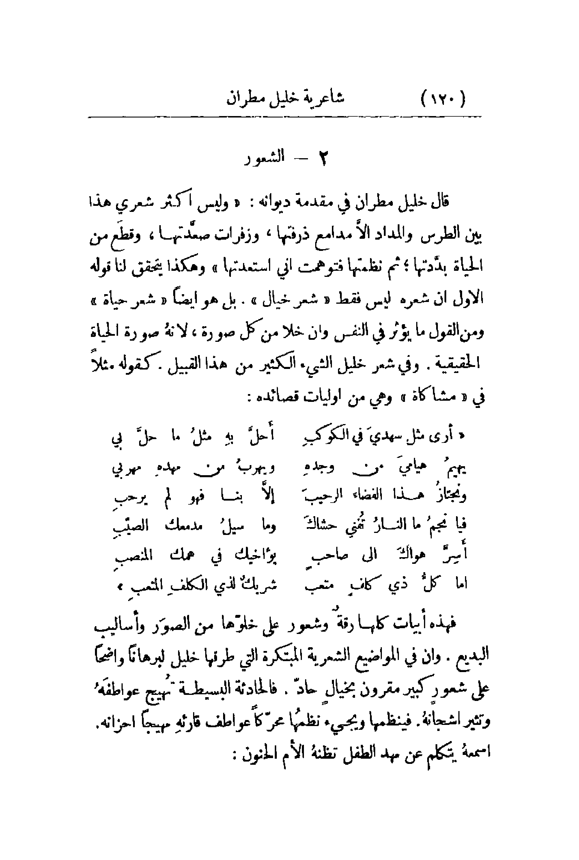 قال خليل مطران في مقدمة ديوانه: وليس أكثر شعري هذا بين الطرس والمداد إلاَّ مدامع ذرفتها , وزفرات صعَّدتهاو وقطع من الحياة بدَّدتها؛ ثم نظمتها فتوهمت أني استعدتها. وهكذا يتحقق لنا قوله الأول أن شعره ليس فقط شعر خيال. بل هو أيضاً شعر حياة ومن القول ما يؤثر في النفس وأنّ خلا من كل صورة , لأنهُ صورة الحياة الحقيقية. وفي شعر خليل الشيء الكثير من هذا القبيل. كقوله مثلاً في مشاكاة وهي من أوليات قصائده: