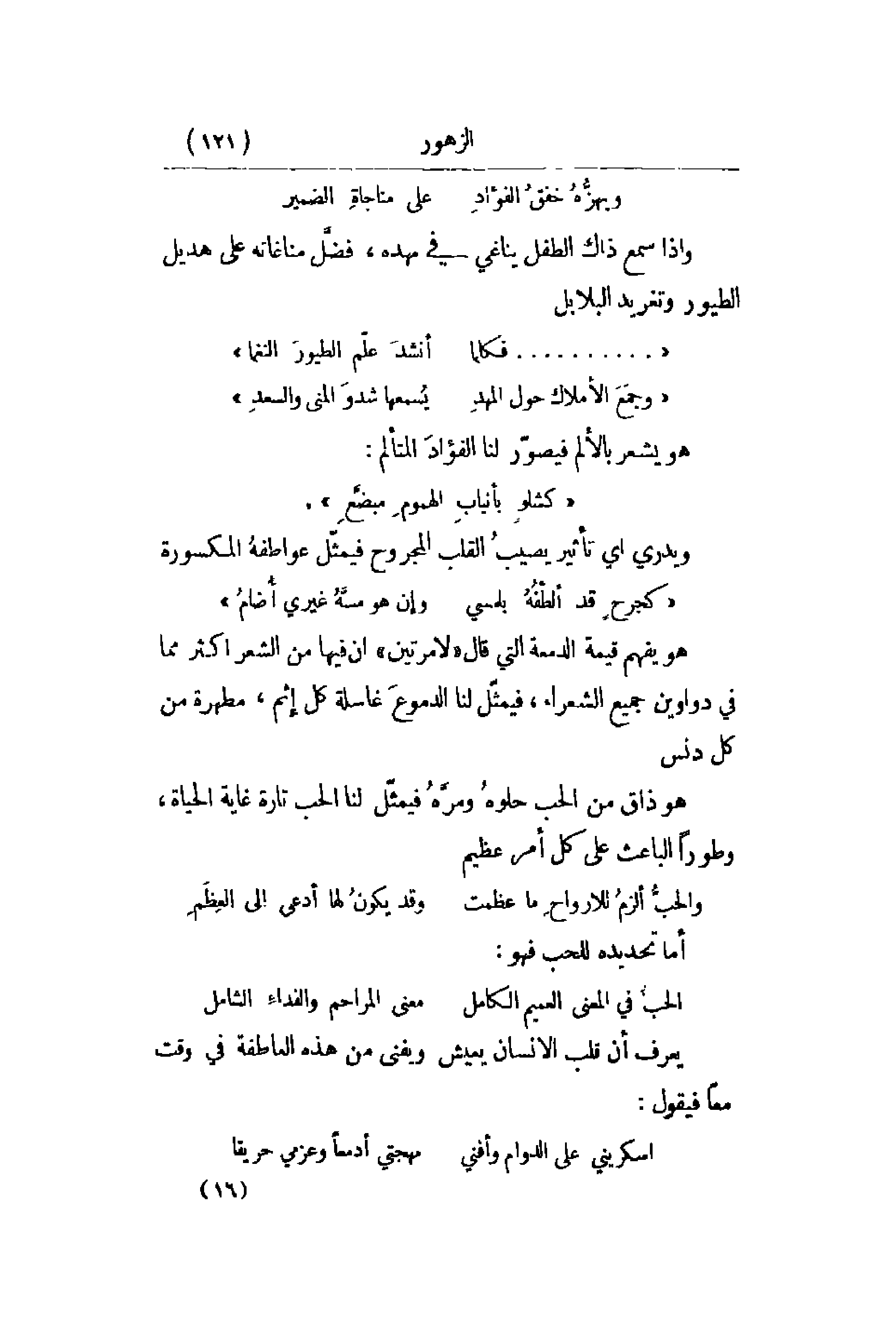 هو يفهم قيمة الدمعة التي قال لامرتين أن فيها من الشعر أكثر مما في دواوين الشعراء , فيمثّل لنا الدموعَ غاسلة كل إثم , مطهرة من كل دنس. وهو ذاق من الحب حلوهُ ومرَّهُ فيمثّل لنا الحب تارة غاية الحياة , وطوراً الباعث على كل أمر عظيم: