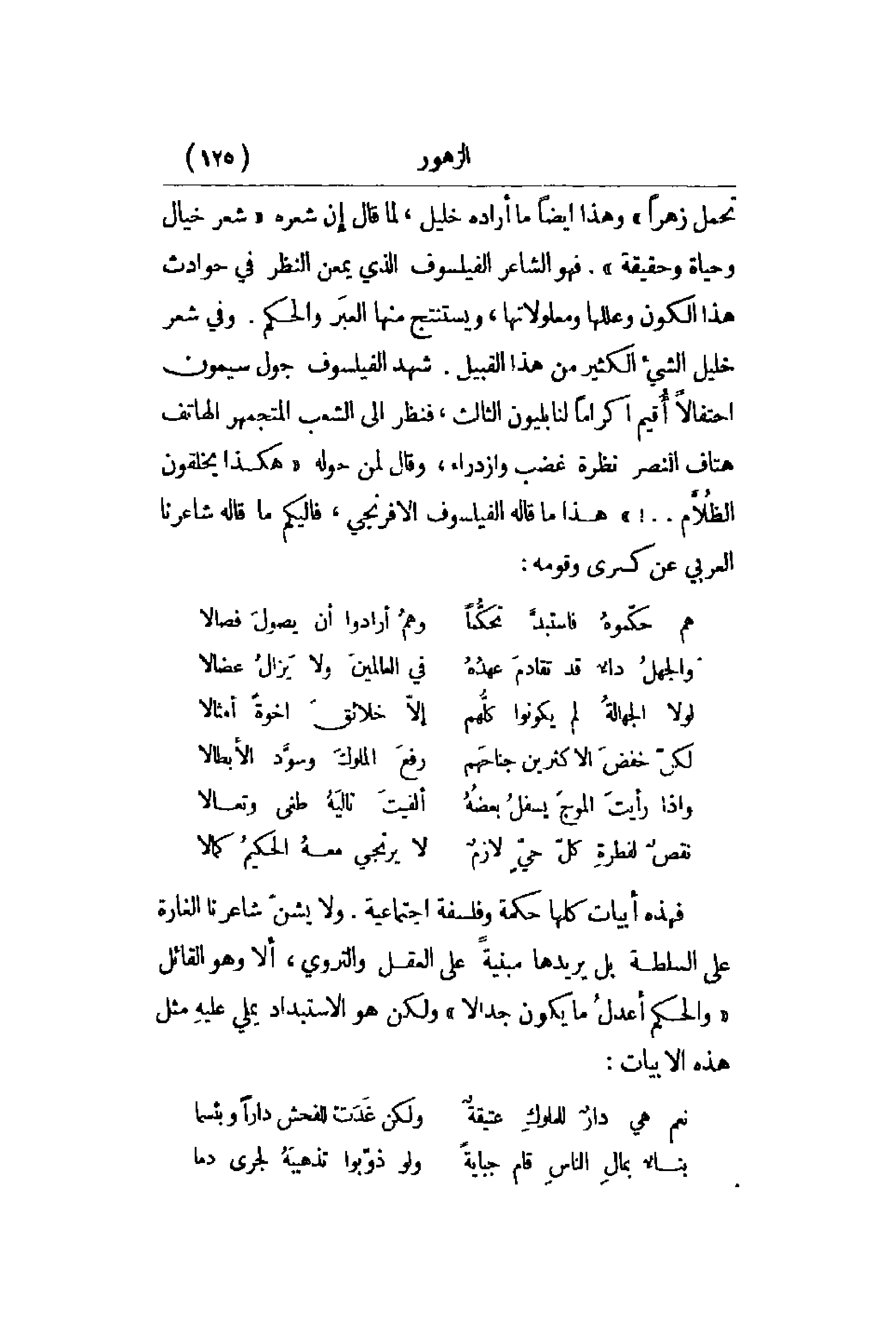 تحمل زهراً وهذا ايضاً ما أراده خليل , لما قال إن شعره شعر خيال وحياة وحقيقة. فهو الشاعر الفيلسوف الذي يمعن النظر في حوادث هذا الكون وعللها ومعلولاتها , ويستنتج منها العبَر والحكم. وفي شعر خليل الشيء الكثير من هذا القبيل. شهد الفيلسوف جول سيمون احتفالاً أُقيم إكراماً لنابليون الثالث , فنظر إلى الشعب المتجمهر الهاتف هتاف النصر نظرة غضب وازدراء , وقال لمن حوله هكذا يخلقون الظُلاَّم. . .! هذا ما قاله الفيلسوف الإفرنجي , فإليكم ما قاله شاعرنا العربي