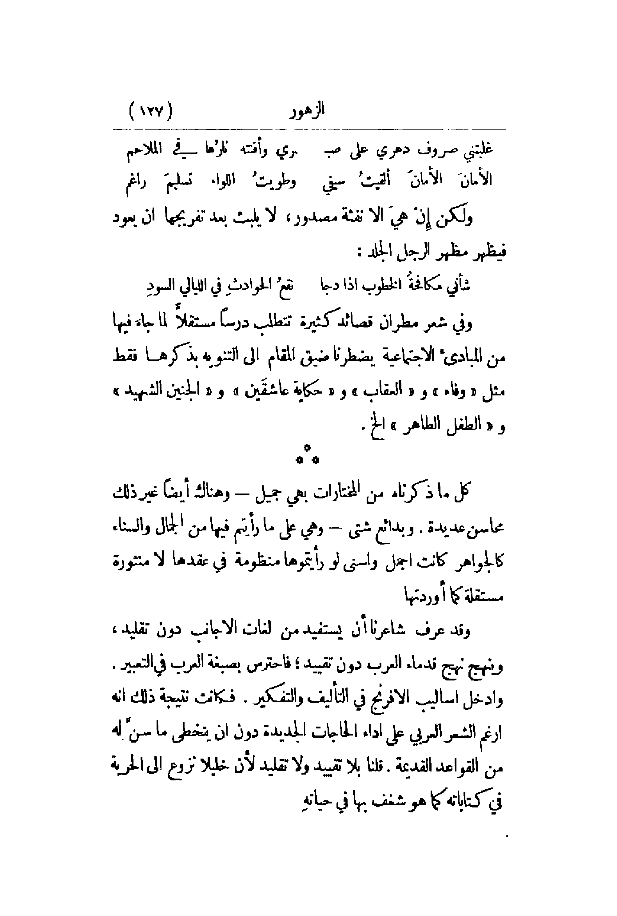 وفي شعر مطران قصائد كثيرة تتطلب درساً مستقلاًّ لما جاءَ فيها من المبادئ الاجتماعية يضطرنا ضيق المقام إلى التنويه بذكرها فقط مثل وفاء والعقاب وحكاية عاشقَين والجنين الشهيد والطفل الطاهر الخ. كل ما ذكرناه من المختارات بهي جميل - وهناك أيضاً غير ذلك محاسن عديدة. وبدائع شتى - وهي على ما رأيتم فيها من الجمال والسناء كالجواهر كانت أجمل وأسنى لو رأيتموها منظومة في عقدها لا منثورة مستقلة كما أوردتها. وقد عرف شاعرنا أن يستفيد من لغات الأجانب دون تقليد , وينهج نهج قدماء العرب دون تقييد؛ فاحترس بصبغة العرب في التعبير. وادخل أساليب الإفرنج في التأليف والتفكير. فكانت نتيجة ذلك أنه أرغم الشعر العربي على أداء الحاجات الجديدة دون أن يتخطى ما سنَّ له من القواعد القديمة. قلنا بلا تقييد ولا تقليد لأن خليلا نزوع إلى الحرية في كتاباته كما هو شغف بها في حياتهِ.