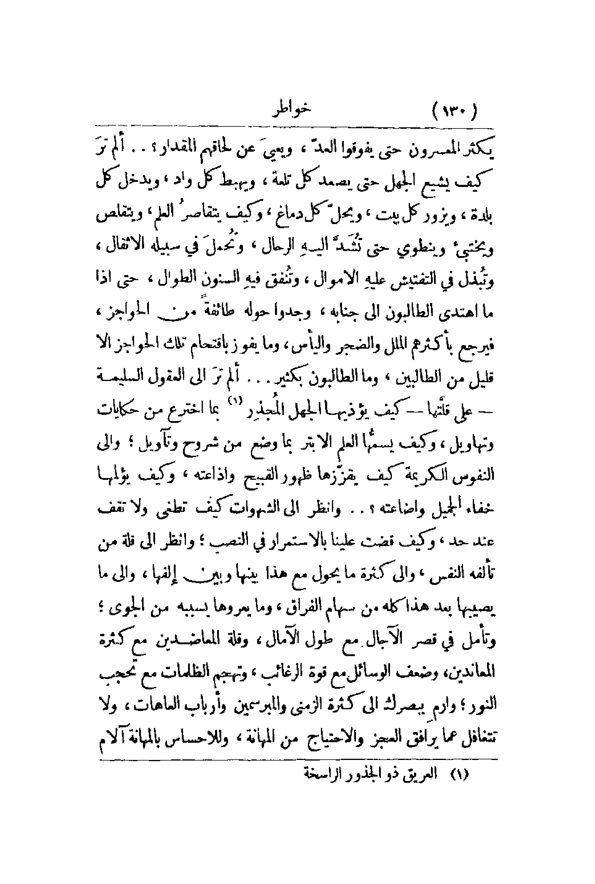 يكثر المعسرون حتى يفوقوا العدّ , ويعيَ عن لحاقهم المقدار؟. . ألم ترَ كيف يشبع الجهل حتى يصعد كل تلعة , ويهبط كل واد , ويدخل كل بلدة , ويزور كل بيت , ويحلّ كل دماغ , وكيف يتقاصرُ العلم , ويتقلص ويختبئ وينطوي حتى تُشَدَّ إليهِ الرحال , وتُحملَ في سبيله الأثقال , وتُبذل في التفتيش عليهِ الأموال , وتُنفق فيهِ السنون الطوال , حتى إذا ما اهتدى الطالبون إلى جنابه , وجدوا حوله طائفة من الحواجز , فيرجع بأكثرهم الملل والضجر واليأس , وما يفوز باقتحام تلك الحواجز إلا قليل من الطالبين , وما الطالبون بكثير. . . ألم ترَ إلى العقول السليمة - على قلَّتها - كيف يؤذيها الجهل المُجذِر بما اخترع من حكايات وتهاويل , وكيف يسمُّها العلم الأبتر بما وضع من شروح وتآويل؛ وإلى النفوس الكريمة كيف يقزّزها ظهور القبيح وإذاعته , وكيف يؤلمها خفاء الجميل وإضاعته؟. . . وانظر إلى الشهوات كيف تطغى ولا تقف عند حد , وكيف قضت علينا بالاستمرار في النصب؛ وانظر إلى قلة