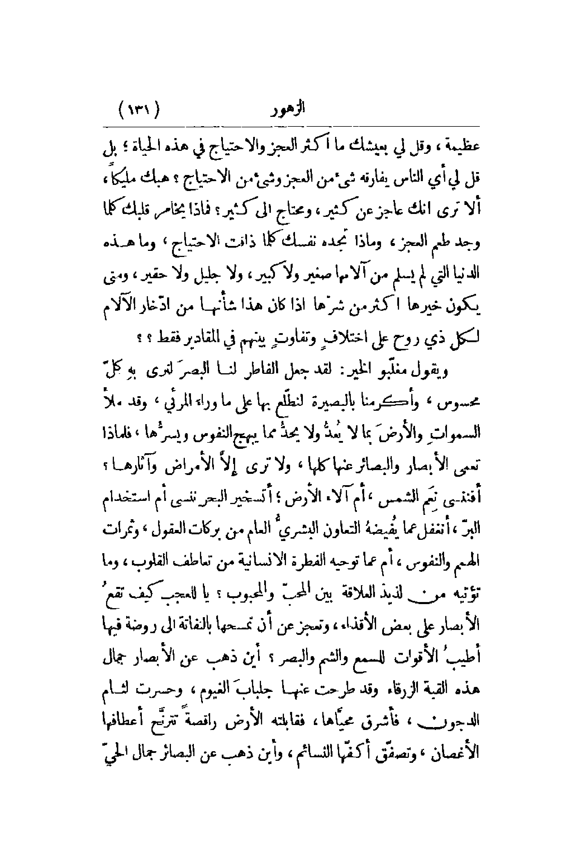 عظيمة , وقل لي بعيشك ما أكثر العجز والاحتياج في هذه الحياة؛ بل قل لي أي الناس شيء من العجز وشيء من الاحتياج؟ هبك مليكاً , ألا ترى أنك عاجز عن كثير , ومحتاج إلى كثير؟ فماذا يخامر قلبك كلما وجد طعم العجز , وماذا تجده نفسك كلما ذاقت الاحتياج , وما هذا الدنيا التي لم يسلم من آلامها صغير ولا كبير , ولا جليل ولا حقير , ومتى يكون خيرها أكثر من شرّها إذا كان هذا شأنها من ادّخار الآلام لكل ذي روح على اختلافٍ وتفاوتٍ بينهم في المقادير فقط؟؟ ويقول مغلّبو الخير: لقد جعل الفاطر لنا البصرَ لنرى بهِ كلّ محسوس , وأكرمنا بالبصيرة لنطّلع بها على ما وراءَ المرئي , وقد ملأ السمواتِ والأرض بما لا يُعدُّ ولا يحدُّ مما يبهج النفوس ويسرُّها , فلماذا تعمى الأبصار والبصائر عنها كلها , ولا ترى إلاَّ الأمراض وآثارها؟ أفننسى نِعَم الشمس , أم آلاء الأرض؛ أتسخير البحر ننسى أم استخدم البرّ , أنغفل عما يُفيضهُ التعاون البشريُّ العام من بركات العقول , وثمرات الهمم والنفوس , أم عما توحيه الفطرة الإنسانية من تعاطف القلوب , وما تؤتيه من لذيذ العلاقة بين المحبّ والمحبوب؟ يا للعجب كيف تقعُ الأبصار على بعض الأقذاء , وتعجز عن أن تسمحها بالتقانة إلى روضة فيها. أطيبُ الأقوات للسمع والشم والبصر؟ أين ذهب عن الأبصار جمال هذه القبة الزرقاء وقد طرحت عنها جلبابَ الغيوم , وحسرت لئام الدجون , فأشرق محيَّاها , فقابلته الأرض راقصةً تترنَّح أعطافها الأغصان , وتصفّق أكفّها النسائم , وأين ذهب عن البصائر جمال الحيّ