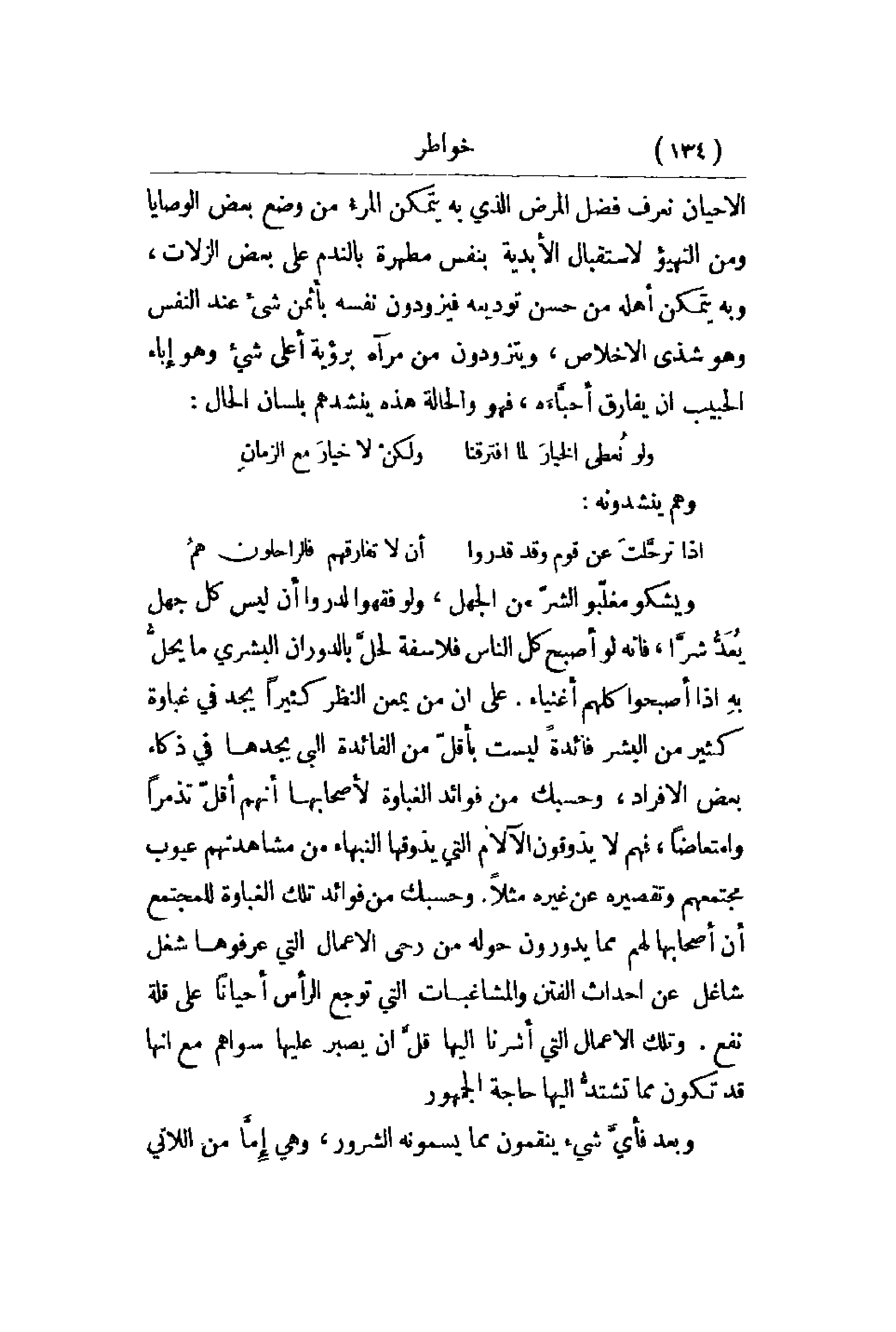الأحيان تعرف فضل المرض الذي به يتمكن المرءُ من وضع بعض الوصايا ومن التهيؤ لاستقبال الأبدية بنفس مطهرة بالندم على بعض الزلات , وبه يتمكن أهله من حسن توديعه فيزودون نفسه بأثمن شيء عند النفس وهو شذى الإخلاص , ويتزودون من مرآه برؤية أعلى شيء وهو إباء الحبيب أن يفارق احبَّاءَه , فهو والحالة هذه ينشدهم بلسان الحال: