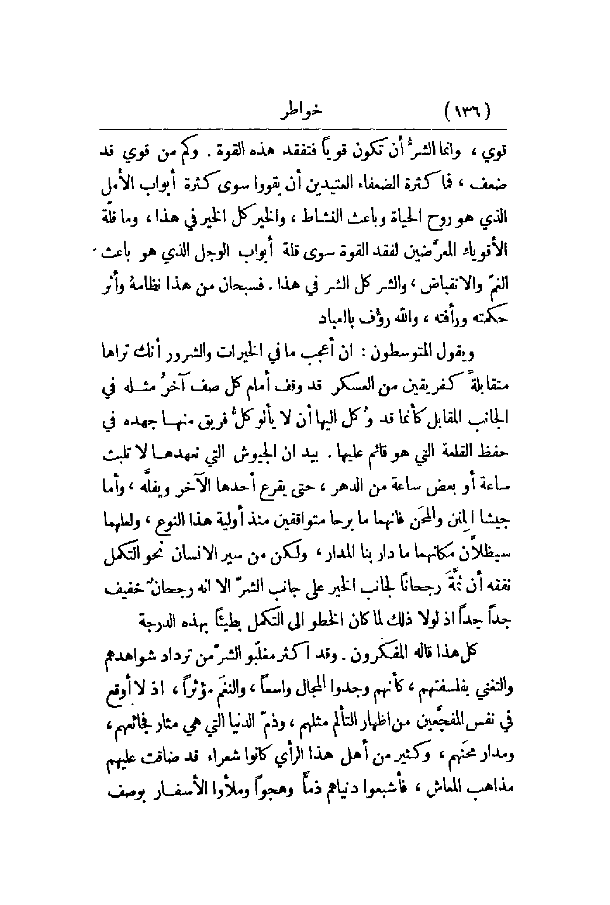 قوي , وإنما الشرُّ أن تكون قوياً فتفقد هذه القوة. وكم من قوي قد ضعف , فما كثرة الضعفاء العتيدين أن يقووا سوى كثرة أبواب الأم الذي هو روح الحياة وباعث النشاط , والخير كل الخير في هذا , وما قلة الأقوياء المعرَّضين لفقد القوة سوى قلة أبواب الوجل الذي هو باعث الغمّ والانقباض , والشر كل الشر في هذا. فسبحان من هذا نظامهُ وأثر حكمته ورأفته , والله رؤُف بالعباد. ويقول المتوسطون: إن أعجب ما في الخيرات والشرور أنك تراها متقابلة كفريقين من العسكر قد وقف أمام كل صف آخرُ مثله في الجانب المقابل كأنما قد وُكل إليها أن لا يألوكلُّ فريق منها جهده في حفظ القلعة التي هو قائم عليها. بيد أن الجيوش التي نعهدها لا تلبث ساعة أو بعض ساعة من الدهر , حتى يقرع أحدها الآخر ويفلَّه , وأما جيشنا المنن والمحنَ فإنهما ما برحا متوافقين منذ أولية هذا النوع , ولعلهما سيظلاَّن مكانهما ما دار بنا المدار , ولكن من سير الإنسان نحو التكمل نفقع أن ثمَّةَ رجحاناً لجانب الخير على جانب الشرّ إلا أنه رجحانٌ خفيف جداً جداً إذ لولا ذلك لما كان الخطو إلى التكمل بطيئاً بهذه الدرجة. كل هذا قاله المفكرون. وقد أكثر مغلّبو الشرّ من ترداد شواهدهم والتغني بفلسفتهم , كأنهم وجدوا المجال واسعاً , والنغَم مؤثراً , إذ لا أوقع في نفس المفجَّعين من إظهار التألم مثلهم , وذمّ الدنيا التي هي مثار فجائعهم , ومدار محَنهم , وكثير من أهل هذا الرأي كانوا شعراء قد ضاقت عليهم مذاهب المعاش , فأشبعوا دنياهم ذمّاً وهجواً وملأوا الأسفار بوصف