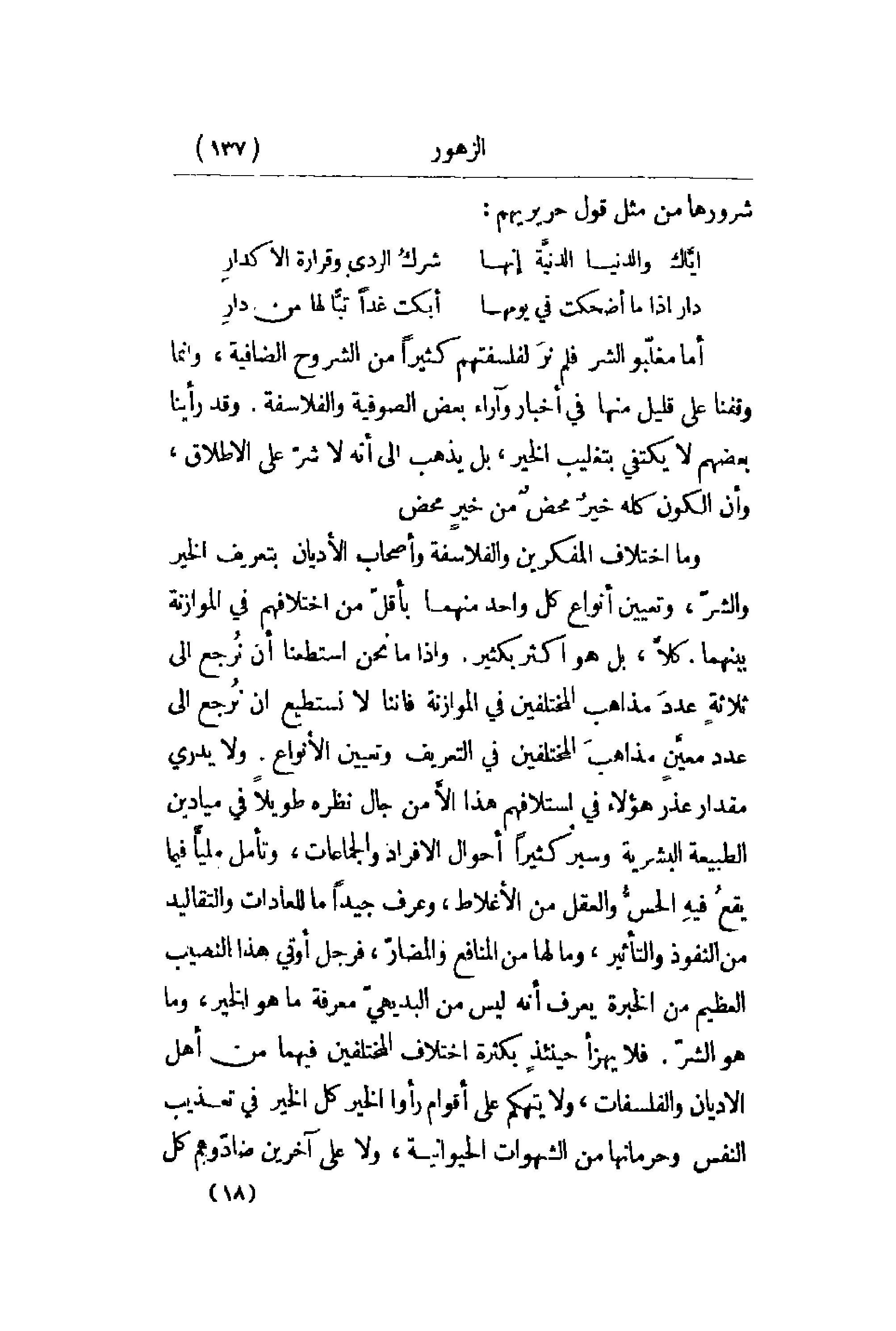 أما مغلّبو الشر فلم نرَ لفلسفتهم كثيراً من الشروح الضافية , وإنما وقفن على قليل منها في أخبار وآراء بعض الصوفية والفلاسفة. وقد رأينا بعضهم لا يكتفي بتغليب الخير , بل يذهب إلى أنه لا شرّ على الإطلاق , وأن الكون كله خيرٌ محضنٌ من خيرٍ محض. وما اختلاف المفكرين والفلاسفة وأصحاب الأديان بتعريف الخير والشرّ , وتعيين أنواع كل واحد منهما بأقلّ من اختلافهم في الموازنة بينهما. كلاَّ , بل هو أكثر بكثير. وإذا ما نحن استطعنا أن نُرجع إلى ثلاثةٍ عددّ مذاهب المختلفين في الموازنة فإننا لا نستطيع أن نُرجع إلى عدد معيَّنٍ مذاهبَ المختلفين في التعريف وتعيين الأنواع. ولا يدري مقدار عذر هؤلاء في استلافهم هذا إلاَّ من جال نظره طويلاً في ميادين الطبيعة البشرية وسبر كثيراً أحوال الأفراد والجماعات , وتأمل مليّاً فيما يقعُ فيهِ الحسُّ والعقل من الأغلاط , وعرف جيداً ما للعادات والتقاليد من النفوذ والتأثير , وما لها من المنافع والمضارّ , فرجل أوتي هذا النصيب العظيم من الخبرة يعرف أنه ليس من البديهيّ معرفة ما هو الخير , وما هو الشرّ. فلا يهزأ حينئذٍ بكثرة اختلاف المختلفين فيهما من أهل الأديان والفلسفات , ولا يتكهم على أقوام رأوا الخير كل الخير في تعذيب الأديان والفلسفات , ولا يتهكم على أقوام رأوا الخير كل الخير في تعذيب النفس وحرمانها من الشهوات الحيوانية , ولا على آخرين ضادّوهم كل