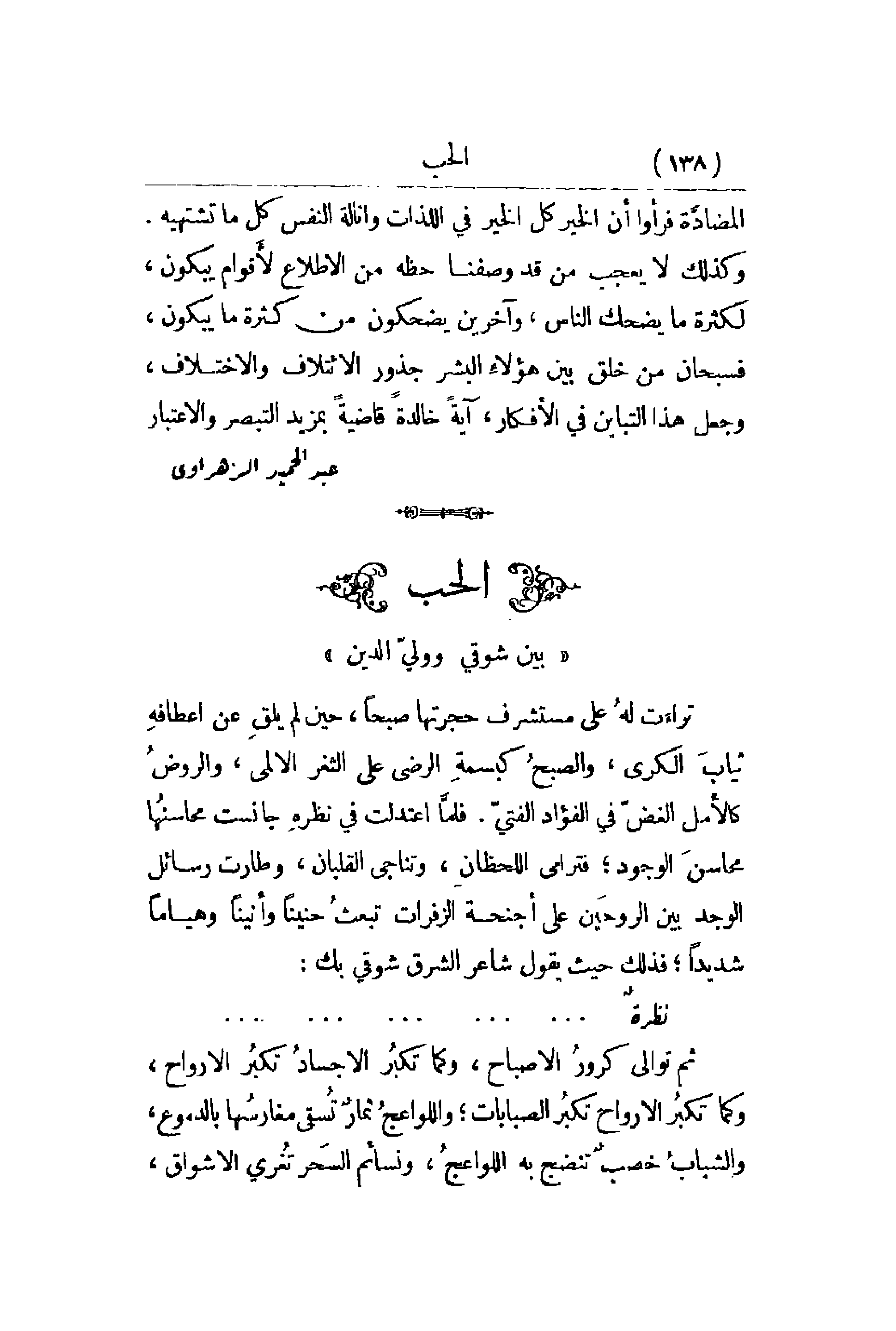 تراءَت لهُ على مستشرف حجرتها صبحاً , حين لم يلقِ عن أعطافهِ ثيابَ الكرى , والصبحُ كبسمةِ الرضي على الثغر الألمى , والروضُ كالأمل الغضّ في الفؤاد الفتيّ. فلمَّا اعتدلت في نظرهِ جانست محاسنُها محاسن الوجد بين الروحين على أجنحة الزفرات تبعثُ حنيناً وأنيناً وهياماً شديداً؛ فذلك حيث يقول شاعر الشرق شوقي بك: