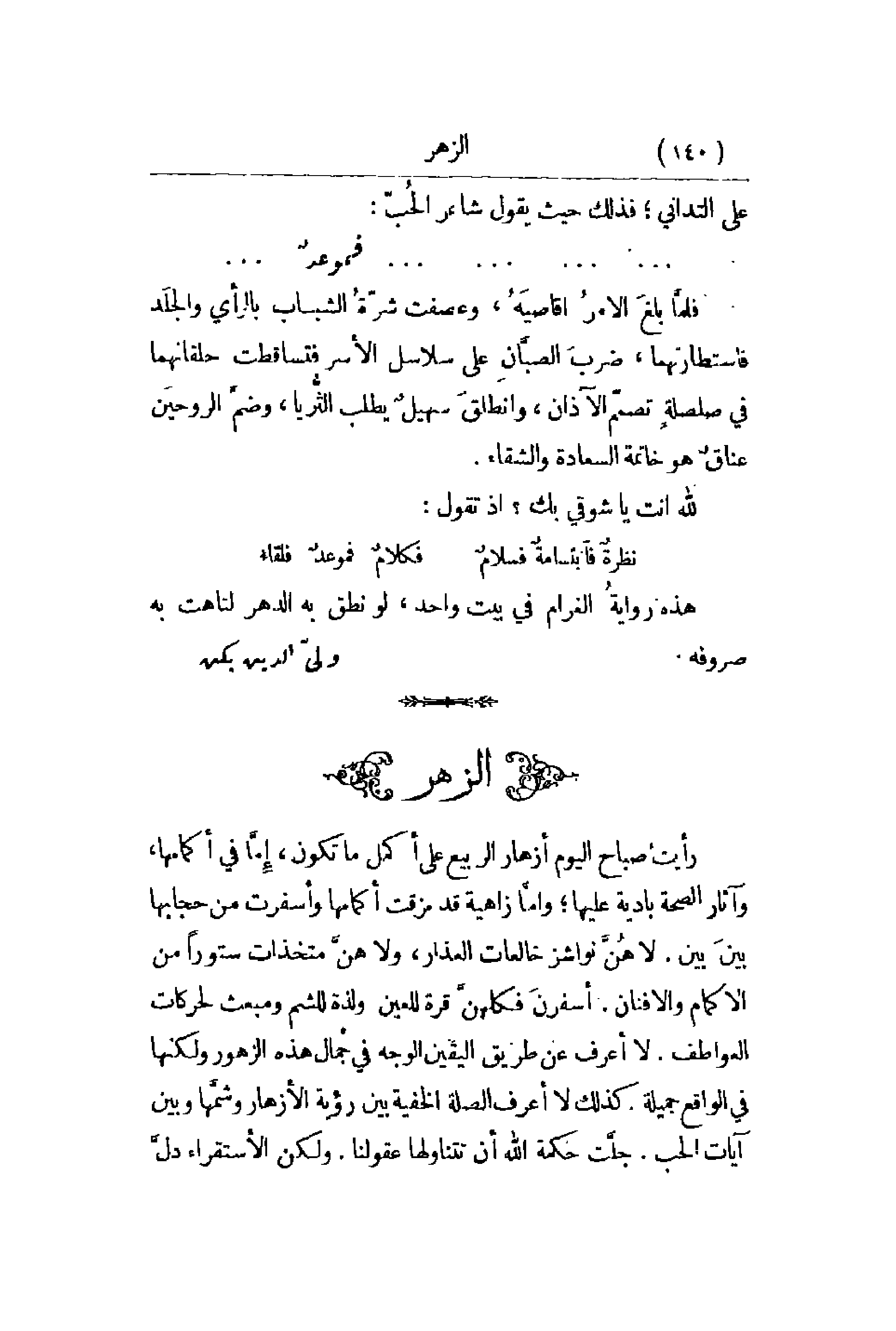 رأيت صباح اليوم أزهار الربيع على أكمل ما تكون , إِمَّا في أكمامها , وآثار الصحة بادية عليها؛ وأمَّا زاهية قد مزقت أكمامها وأسفرت من حجابها بينَ بين. لاهُنَّ نواشز خالعات العذار , ولا هنَّ متخذات ستوراً من الأكمام والأفنان. أسفرنَ فكلهنَّ قرة للعين ولذة للشم ومبعث لحركات العواطف. لا أعرف عن طريق اليقين الوجه في جمال هذه الزهور ولكنها في الواقع جميلة. كذلك لا أعرف الصلة الخفية بين رؤية الأزهار وشمَّها وبين آيات الحب. جلَّت حكمة الله أن تتناولها عقولنا. ولكن الاستقراء دلَّ