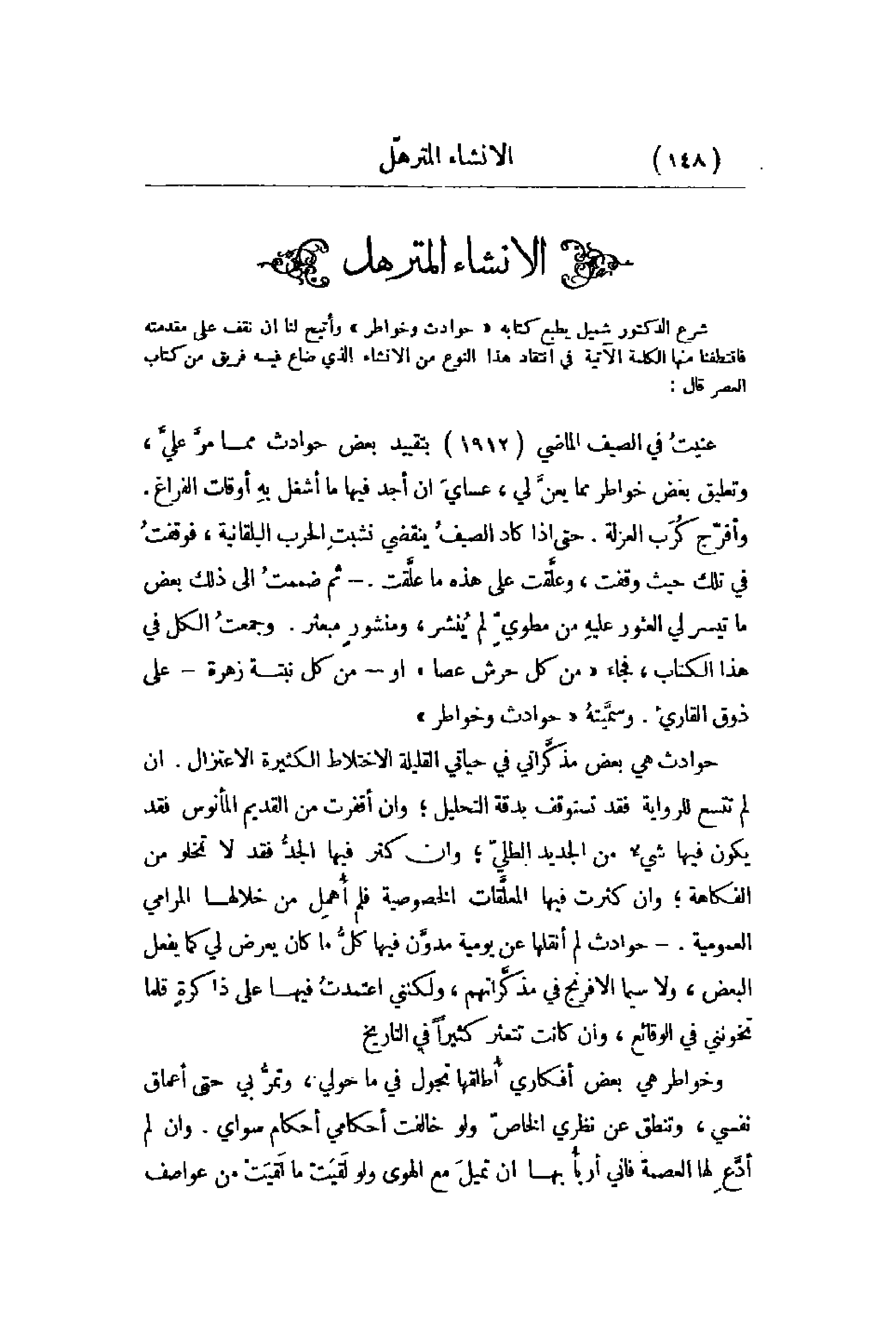 شرح الدكتور شميل يطبع كتابه حوادث وخواطر وأتيح لنا أن نقف على مقدمته فاقتطفنا منها الكلمة الآتية في انتقاد هذا النوع من الإنشاء الذي ضاع فيه فريق من كتاب العصر قال:
