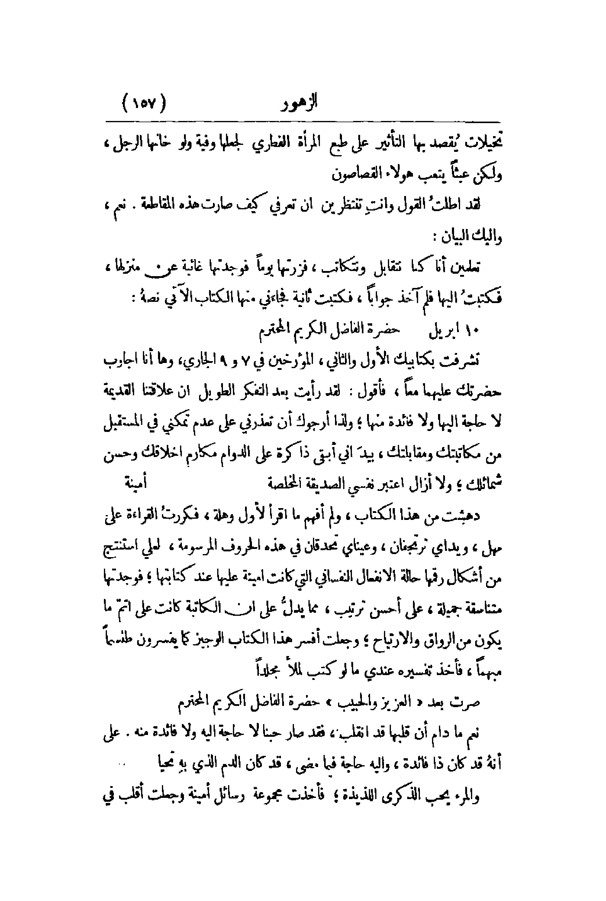 تخيلات يٌقصد بها التأثير على طبع المرأة الفطري لجعلها وفية ولو خانها الرجل , ولكن عبثاً يتعب هؤلاء القصاصون. لقد أطلتُ القول وأنتِ تنتظرين أن تعرفي كيف صارت هذه المقاطعة. نعم , وإليك البيان: تعلمين أنا كنا نتقابل ونتكاتب , فزرتها يوماً فوجدتها غائبة عن منزلها , فكتبتُ إليها فلم آخذ جواباً ,