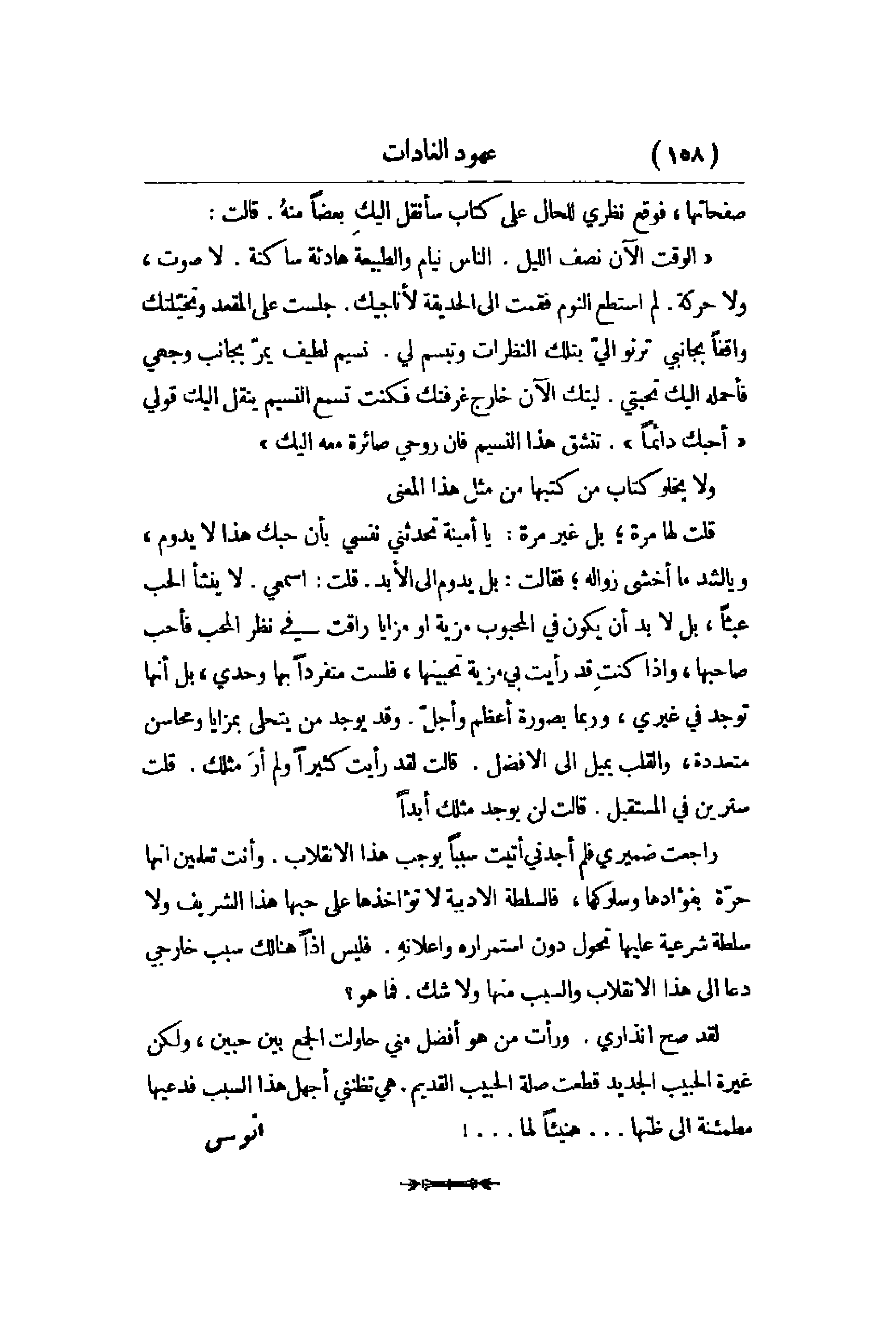 يكون في المحبوب مزية أو مزايا راقت في نظر المحب فأب صاحبها , وإذا كنتِ قد رأيت بي مزية تحبينها , فلست متفرداً بها وحدي , بل أنها توجد في غيري , وربما بصورة أعظم وأجلّ. وقد يوجد من يتخلى بمزايا ومحاسن متعددة , والقلب يميل إلى الأفضل. قالت لقد رأيت كثيراً ولم أرَ مثلك. قلت سترين في المستقبل. قالت لن يوجد مثلك أبداً. راجعت ضميري فلم أجدني أتيت سبباً يوجب هذا الانقلاب. وأنت تعلمين أنها حرّة بفؤادها وسلوكها , فالسلطة الأدبية لا تؤاخذها على حبها هذا الشريف ولا سلطة شرعية عليها تحول دون استمراره وإعلانهِ. فليس إذاً هنالك سبب خارجي دعا إلى هذا الانقلاب والسبب منها ولا شك. فما هو؟ لقد صح إنذاري. ورأت من هو أفضل مني حاولت الجمع بين حبين , ولكن غيرة الحبيب الجديد قطعت صلة الحبيب القديم. هي تظنني أجهل هذا السبب فدعيها مطمئنة إلى ظنها. . . هنيئاً لها. . .!