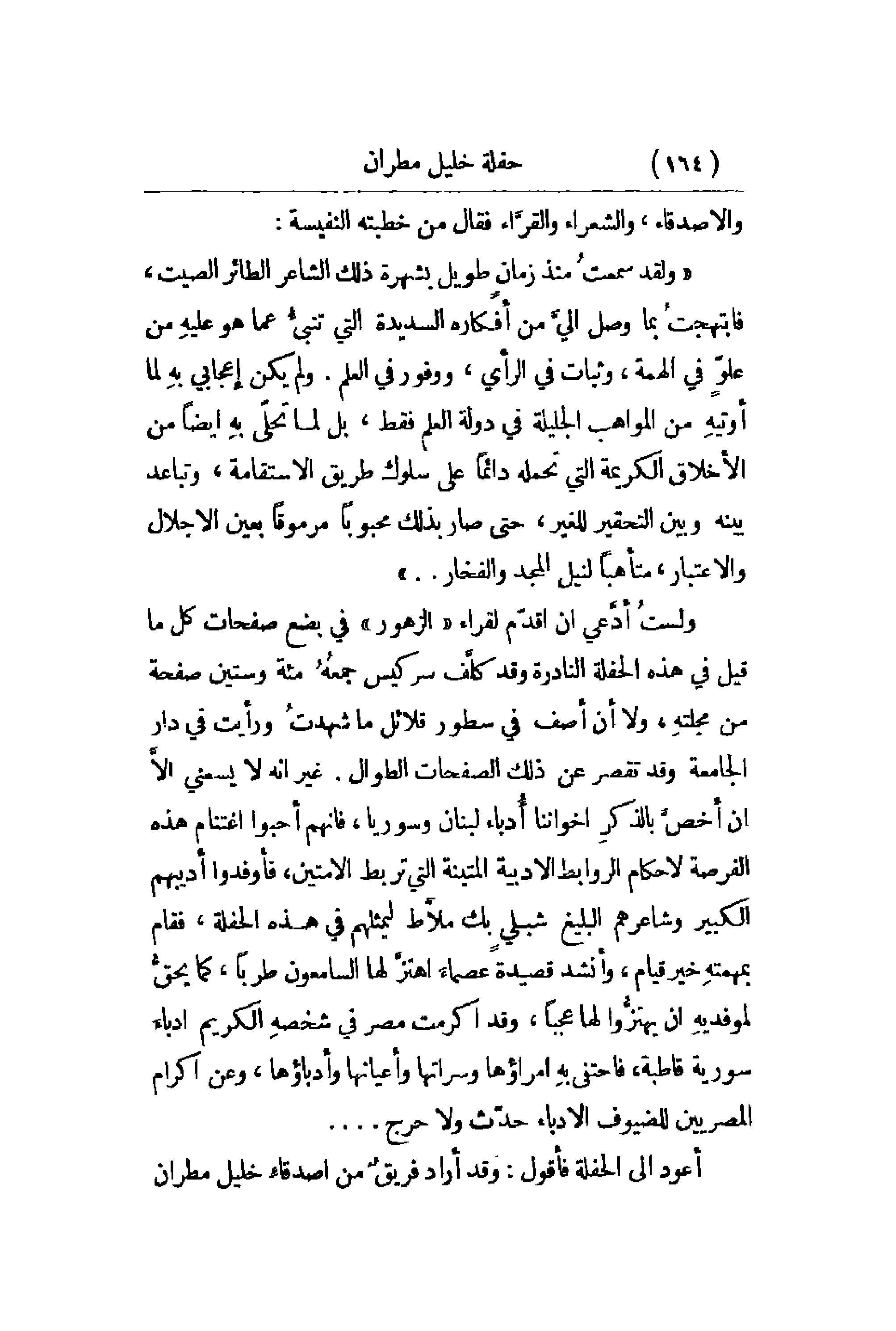 ولقد سمعتُ منذ زمانٍ طويل بشهرة ذلك الشاعر الطائر الصيت , فاتهجتُ بما وصل إليَّ من أفكاره السديدة التي تنبئُ عما هو عليهِ من علوٍّ في الهمة , وثبات في الرأي , ووفور في العلم. ولم يكن إعجابي بهِ لما أوتيهِ من المواهب الجليلة في دولة العلم فقط , بل لما تحلّى بهِ أيضاً من الأخلاق الكريمة التي تحمله دائماً على سلوك طريق الاستقامة , وتباعد بينه وبين التحقير للغير , حتى صار بذلك محبوباً مرموقاً بعين الإجلال والاعتبار , متأهباً لنيل المجد والفخار. . . ولستُ أدَّعي أن أقدّم لقراء الزهور في بضع صفحات كل ما قيل في هذه الحفلة النادرة وقد كلَّف سركيس جمعُهُ مئة وستين صفحة من مجلتهِ , ولا أن أصف في سطور قلائل ما شهدتُ ورأيت في دار الجامعة وقد تقصر عن ذلك الصفحات الطوال. غير أنه لا يسعني إلاَّ أن أخصَّ بالذكرِ إخواننا أُدباء لبنان وسوريا , فإنهم أحبوا اغتنام هذه الفرصة لأحكام الروابط الأدبية لمتينة التي تربط الأمتين , فأوفدوا أدبيهم الكبير وشاعرهم البليغ شبلي بك ملاَّط ليمثلهم في هذه الحفلة , فقام بمهمتهِ خير قيام , وأنشد قصيدة عصماءَ اهتزَّ لها السامعون طرباً , كما يحقُّ لموفديهِ أن يهتزُّوا لها عجباً , وقد أكرمت مصر في شخصهِ الكرم أدباءَ المصريين للضيوف الأدباء حدّث ولا حرج. . . . أعود إل الحفلة فأقول: وقد أراد فريقٌ من أصدقاءِ خليل مطران