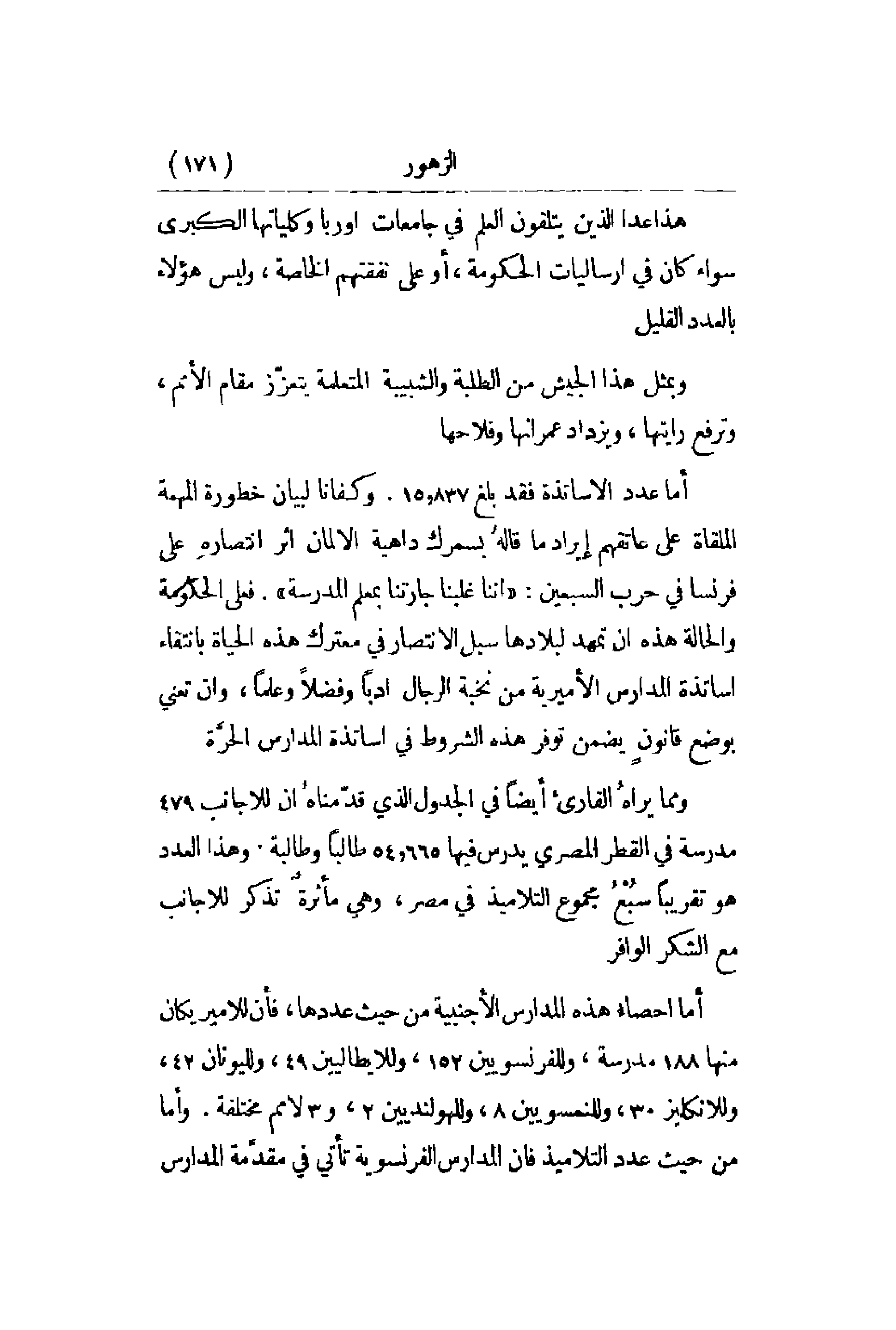 هذا عدا الذين يتلقون العلم في جامعات أوربا وكلياتها الكبرى سواء كان في أرساليات الحكومة , أو على نفقتهم الخاصة , وليس هؤلاء بالعدد القليل. وبمثل هذا الجيش من الطلبة والشبيبة المتعلمة يتعزّز مقام الأمم , وترفع رايتها , ويزداد عمرانها وفلاحها. أما عدد الأساتذة فقد بلغ 15. 837. وكفانا لبيان خطورة المهمة الملقاة على عاتقهم أبراد ما قالهُ بسمرك داهية الألمان أثر انتصارهِ على فرنسا في حرب السبعين: أننا غلبنا جارتنا بمعلم المدرسة. فعلى الحكومة والحالة هذه أن تمهد لبلادها سبل الانتصار في معترك هذه الحياة بانتقاء أساتذة المدارس الأميرية من نخبة الرجال أدباً وفضلاً وعلماً , وأن تعني بوضع قانونٍ يضمن توفر هذه الشروط في أساتذة المدارس الحرَّة. ومما يراهُ القارئ أيضاً في الجدول الذي قدّمناهُ أن للأجانب 479 مدرسة في القطر المصري يدرس فيها 54. 665 طالباً وطالبة. وهذا العدد هو تقريباً سُبْعُ مجموع التلاميذ في مصر , وهي مأثرةٌ تذكر للأجانب مع الشكر الوافر. أما إحصاءُ هذه المدارس الأجنبية من حيث عددها , فأن للأميريكان منها 188 مدرسة , وللفرنسويين 152 , وللإيطاليين 49 , ولليونان 42 , وللانكليز 30 , وللنمسويين 8 , وللهولنديين 2 , و3 لأمم مختلفة. وأما من حيث عدد التلاميذ فإن المدارس الفرنسوية تأتي في مقدَّمة المدارس