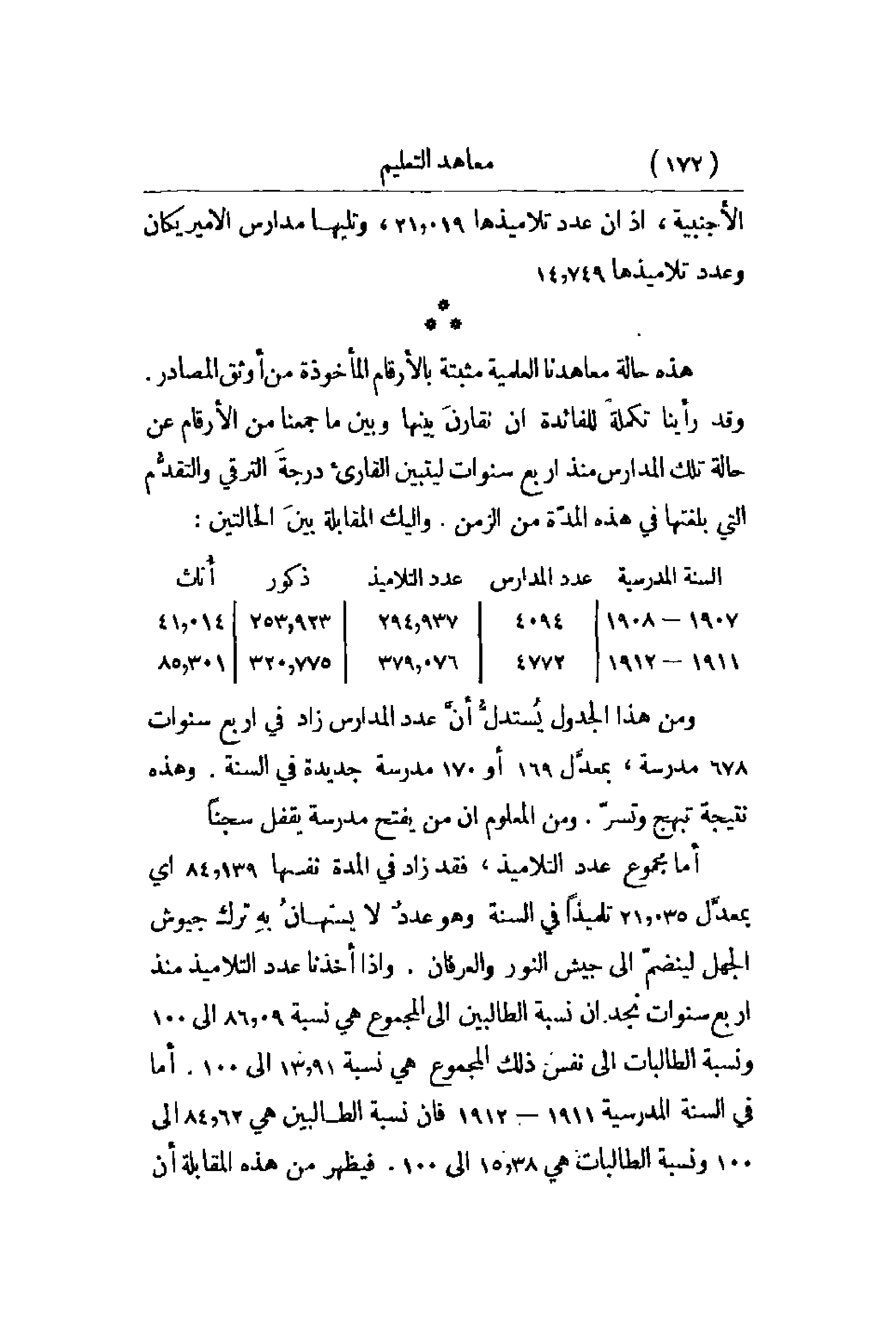 ومن هذا الجدول يُستدلُّ أنَّ عدد المدارس زاد في أربع سنوات 678 مدرسة , بمعدَّل 169 أو 170 مدرسة جديدة في السنة. وهذه نتيجة تبهج وتسرّ. ومن المعلوم أن من يفتح مدرسة يقفل سجناً. أما مجموع عدد التلاميذ , فقد زاد في المدة نفسها 84. 139 أي بمعدَّل 21. 035 تلميذاً في السنة وهو عددٌ لا يستهانُ بهِ ترك جيوش الجهل لينضمّ إلى جيش النور والعرفان. وإذا أخذنا عدد التلاميذ منذ أربع سنوات نجد أن نسبة الطالبين إلى المجموع هي نسبة 13. 91 إلى 100. أما في السنة المدرسية 1911 - 1912 فإن نسبة الطالبين هي 84. 62 إلى 100 ونسبة الطالبات هي 15. 38 إلى 100. فيظهر من هذه المقابلة أن