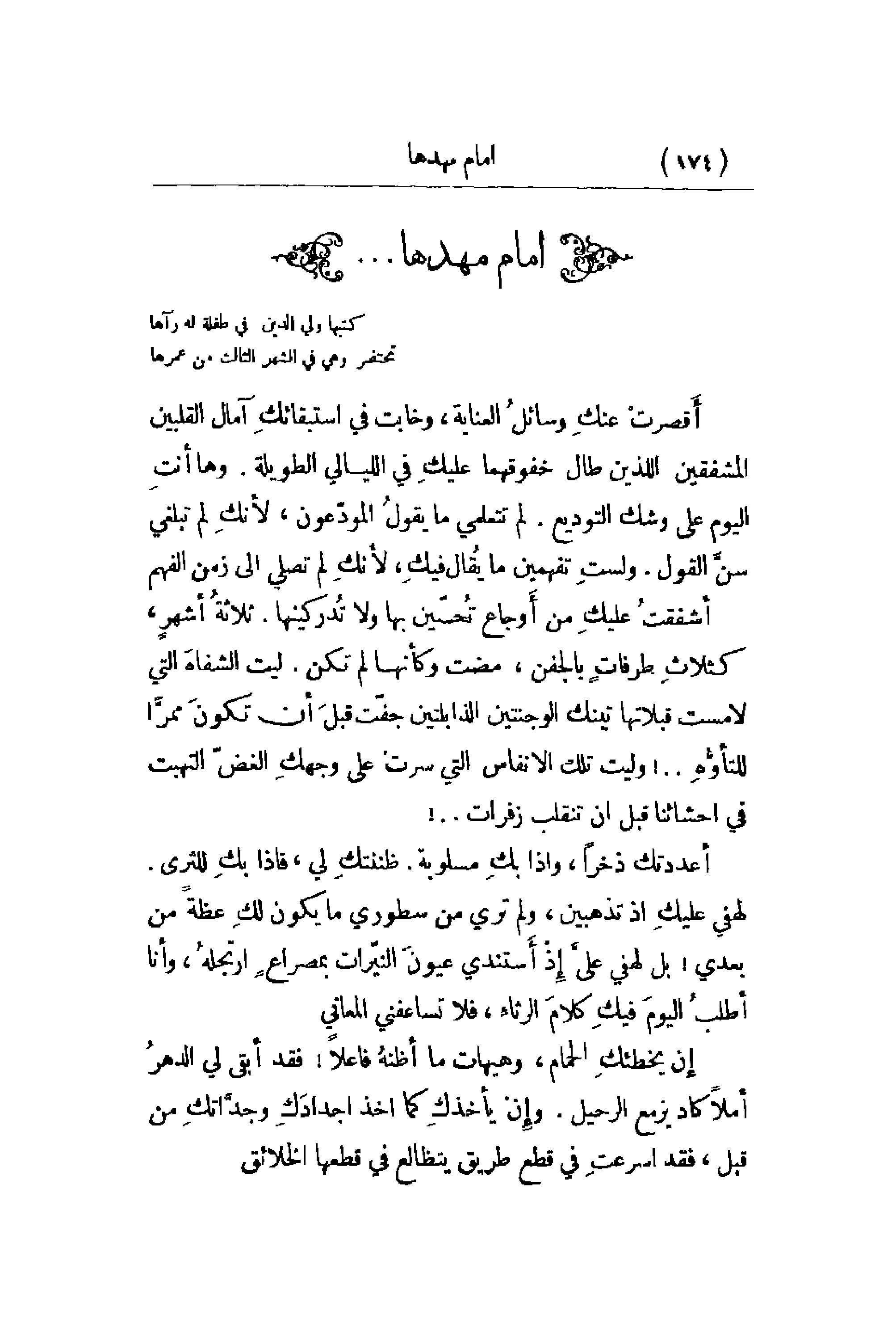 أَقصرتْ عنكِ وسائلُ العناية , وخابت في استبقائكِ آمال القلبين المشفقين اللذين طال خفوقها عليكِ في الليالي الطويلة. وها أنتِ اليوم على وشك التوديع. لم تتعلمي ما يقولُ المودّعون , لأنكِ لم تبلغي سنَّ القول. ولستِ تفهمين ما يُقال فيكِ , لأنكِ لم تصلي إلى زمن الفهم. أشفقتُ عليكِ من أُوجاع تُحسّين بها ولا تُدركينها. ثلاثةُ أشهرٍ , كثلاثِ طرفاتٍ بالجفن , مضت وكأنها لم تكن. ليت الشفاهَ التي لامست قبلاتها تينك الوجنتين الذابلتين جفّت قبلَ أن تكونَ ممرّاً للتأوُّهِ. . .! وليت تلك الأنفاس التي سرتْ على وجهكِ الغضّ التهبت في أحشائنا قبل أن تنقلب زفرات. . .!