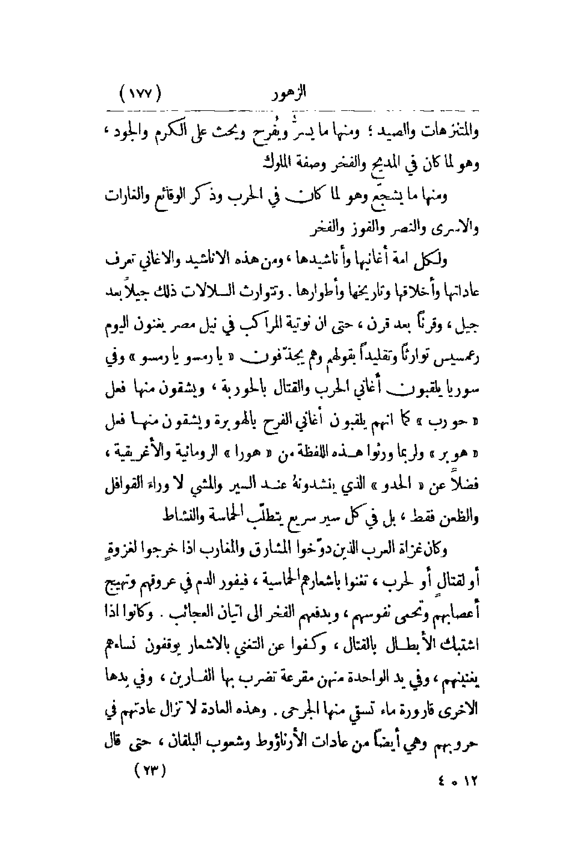والمنتزهات والصيد؛ ومنها ما يسرُّ ويُفرح ويحث على الكرم والجود , وهو لما كان في المديح والفخر وصفة الملوك. ومنها ما يشجّع وهو لما كان في الحرب وذكر الوقائع والغارات والأسرى والنصر والفوز والفخر. ولكل أمة أغانيها وأناشيدها , ومن هذه الأناشيد والأغاني تعرف عاداتها وأخلاقها وتاريخها وأطوارها. وتتوارث السلالات ذلك جيلاً بعد جيل , وقرناً بعد قرن , حتى أن