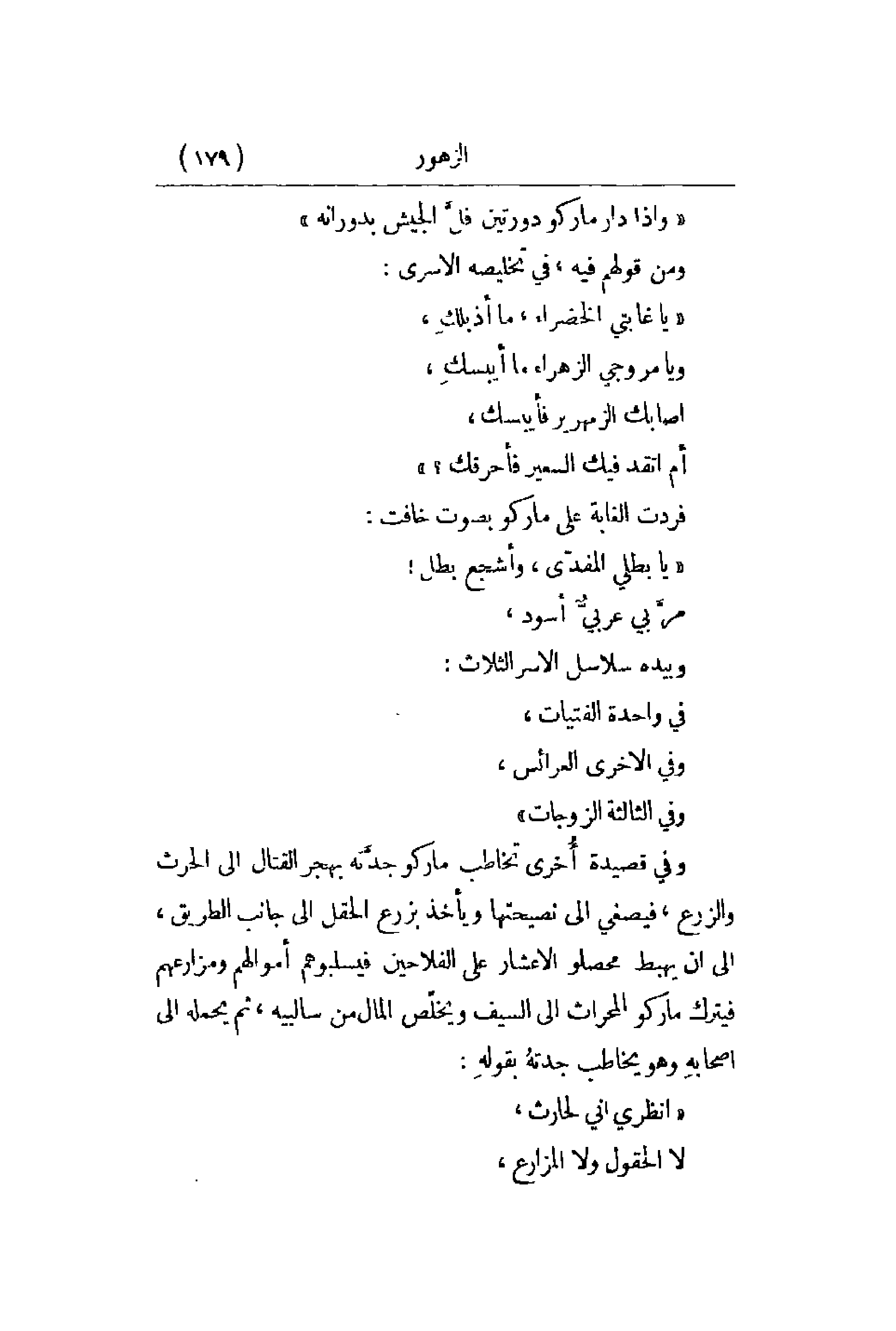 وفي قصيدة أُخرى تخاطب ماركو جدَّته بهجر القتال إلى الحرث والزرع , فيصغي إلى نصيحتها ويأخذ بزرع الحقل على جانب الطريق , إلى أن يهبط محصلو الأعشار على الفلاحين فيسلبوهم أموالهم ومزارعهم فيترك ماركو المحراث إلى السيف ويخلّص المال من سالبيه , ثم يحمله إلى أصحابهِ وهو يخاطب جدتهُ بقولهِ: