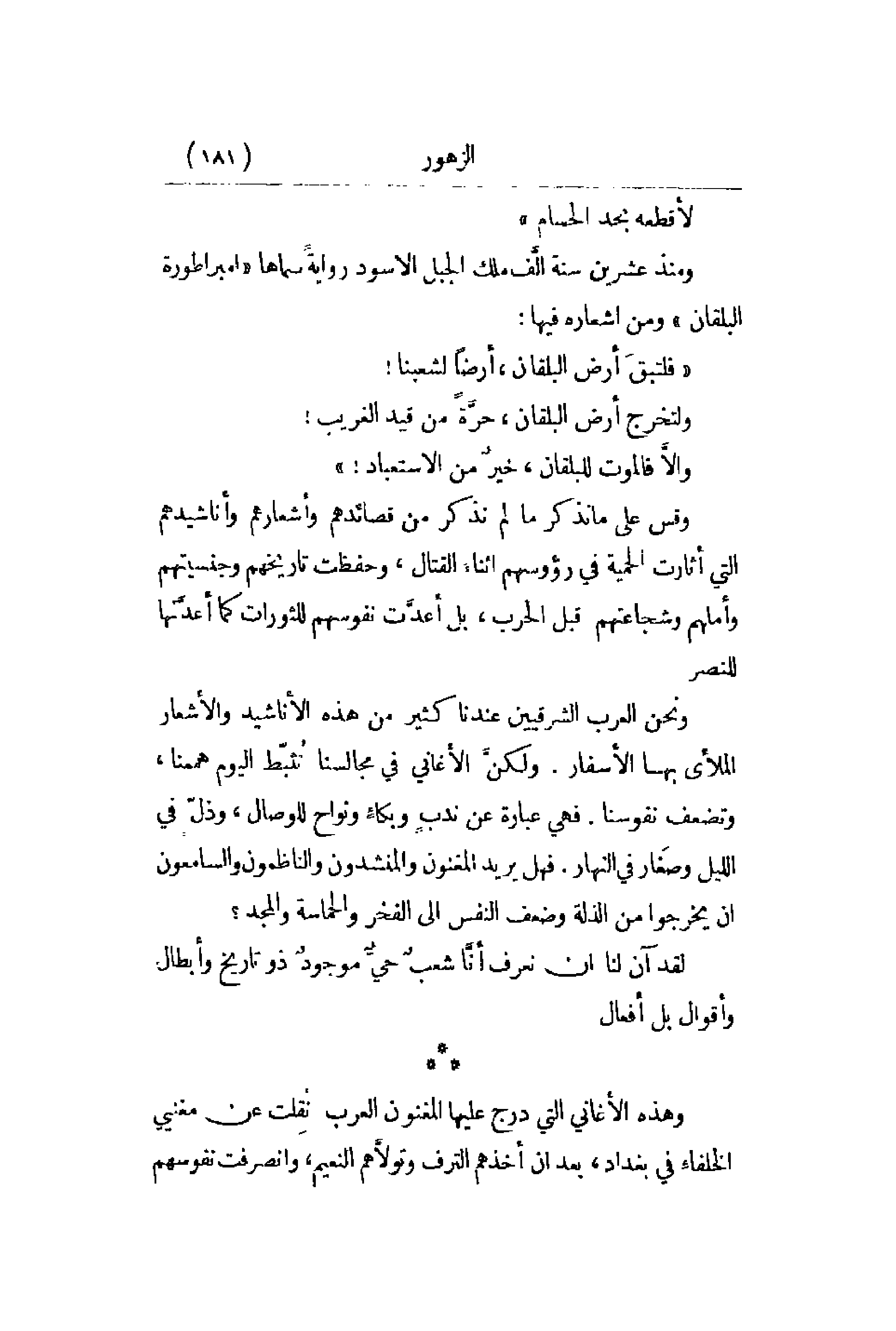 النهار. فهل يريد المغنون والمنشدون والناظمون والسامعون أن يخرجوا من الذلة وضعف النفس على الفخر والحماسة والمجد؟ لقد آن لنا أن نعرف أنَّا شعبٌ حيٌّ ذو تاريخ وأبطال وأقوال بل أفعال.