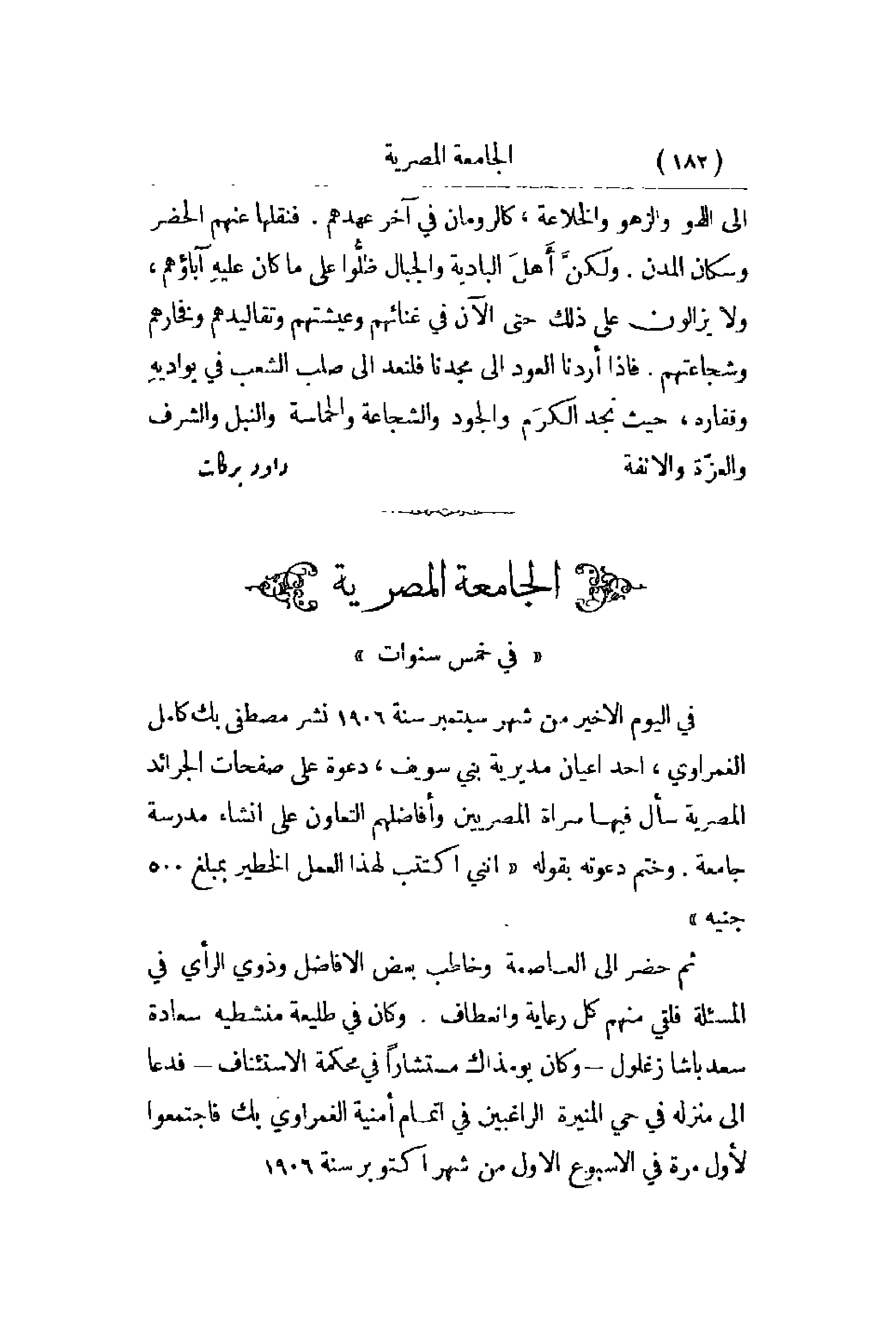 في اليوم الأخير من شهر سبتمبر سنة 1906 نشر مصطفى بك كامل الغمراوي , أحد أعيان مديرية بني سويف , دعوة على صفات الجرائد المصرية سأل فيها سراة المصريين وأفاضلهم التعاون على إنشاء مدرسة جامعة. وختم دعوته بقوله أنني اكتتب لهذا العمل الخطير بمبلغ 500 جنيه ثم حضر إلى العاصمة وخاطب بعض الأفاضل وذوي الرأي في المسئلة فلقي منهم كل رعاية وانعطاف. وكان في طليعة منشطيه سعادة سعد باشا زغلول - وكان يومذك مستشاراً في محكمة الاستئناف - فدعا إلى منزله في حي المنيرة الراغبين في إتمام أمنية الغمراوي بك فاجتمعوا لأول مرة في الأسبوع الأول من شهر أكتوبر سنة 1906.